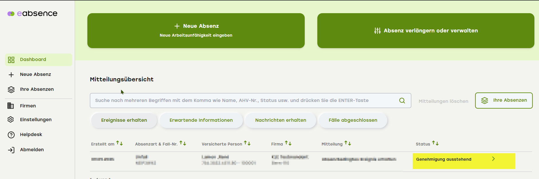 Sie erhalten eine E-Mail und oder Ihnen wird der zu bestätigende Fall im Dashboard (Übersicht) nach dem Login angezeigt. Der Fall ist im Status «Genehmigung ausstehend». Klicken Sie auf den Fall.