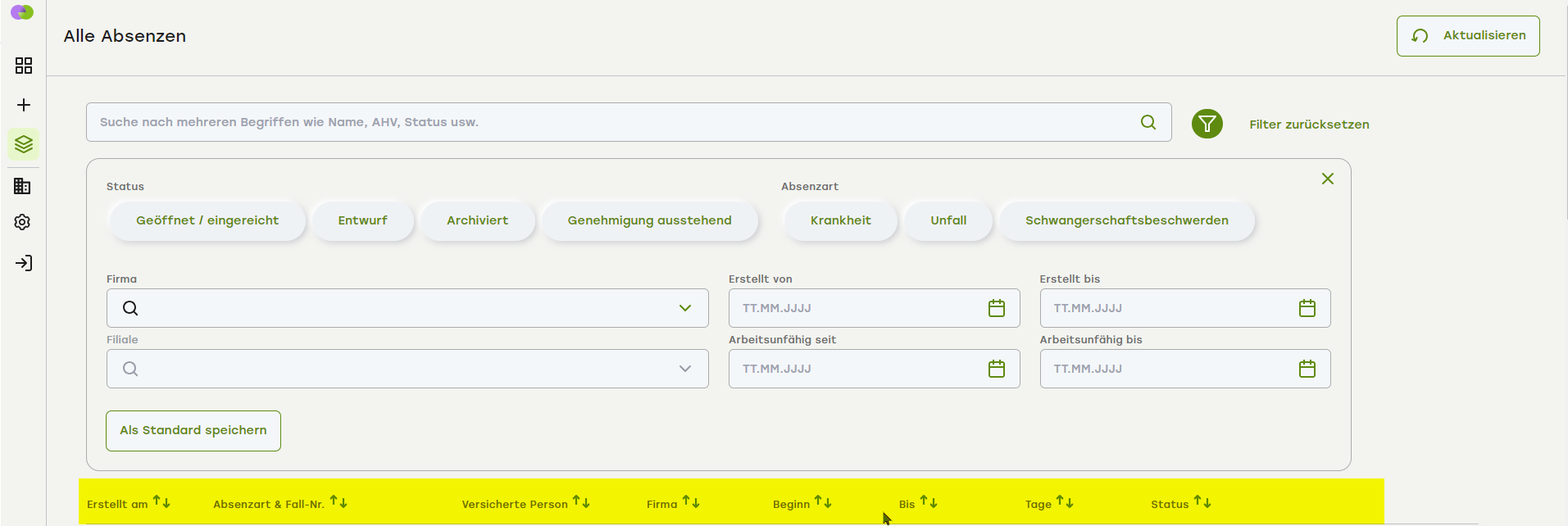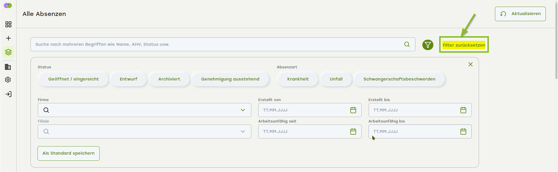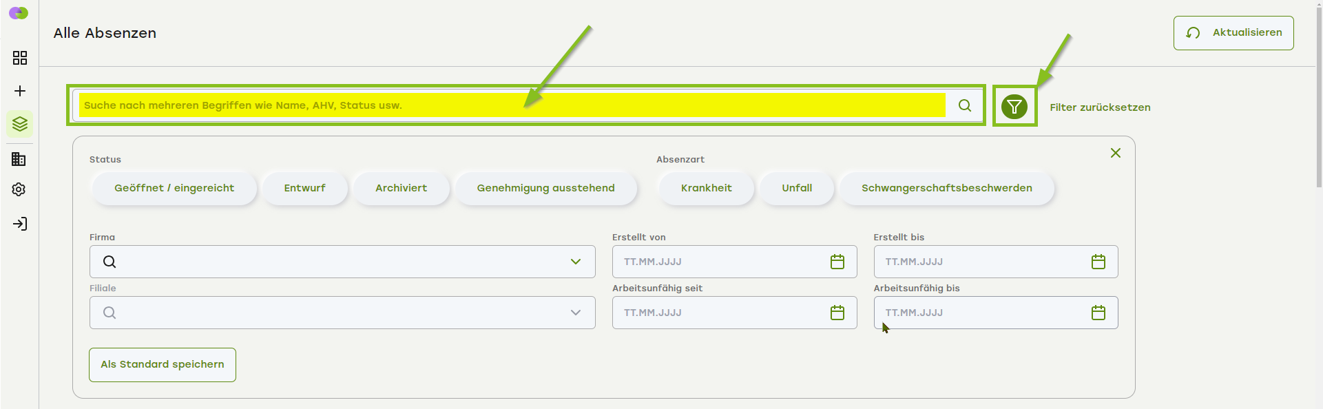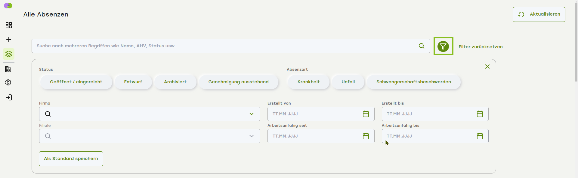 Die Ansicht «Alle Absenzen» klapp auf. Über das Trichtersymbol können Sie die Suchparameter ausklappen.