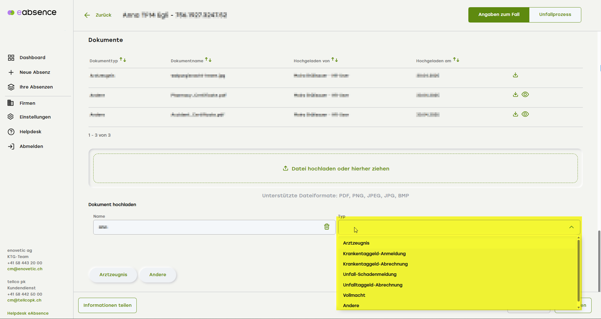 Wählen Sie die korrekte Dokumentenkategorie im Dropdown (gelbe Markierung).