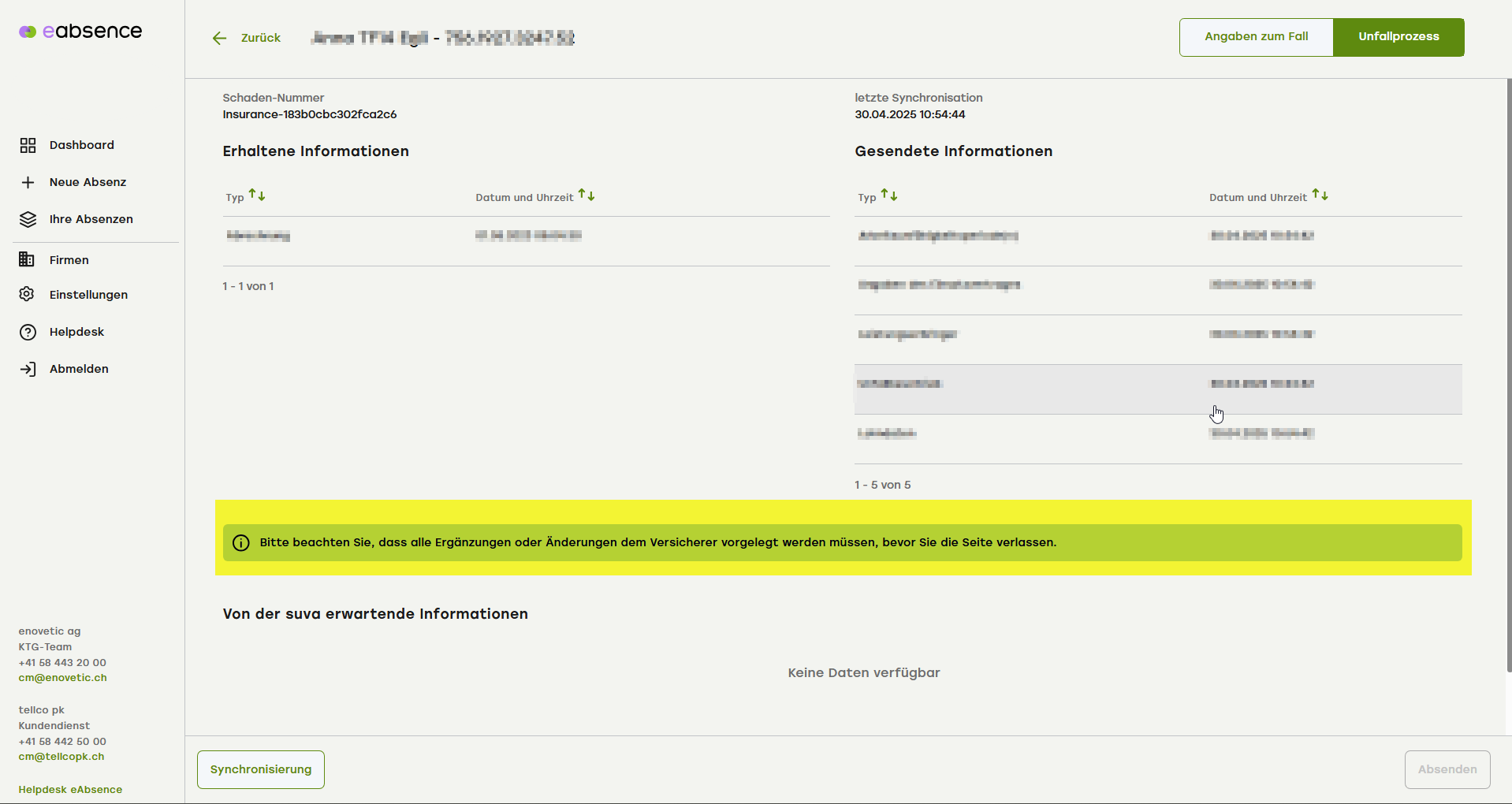 Nun werden Sie in den Bereich «Unfallprozess» weitergeleitet. Bitte beachten Sie die gelb markierte Meldung: «Bitte beachten Sie, dass alle Ergänzungen oder Änderungen dem Versicherer vorgelegt werden müssen, bevor Sie die Seite verlassen».
