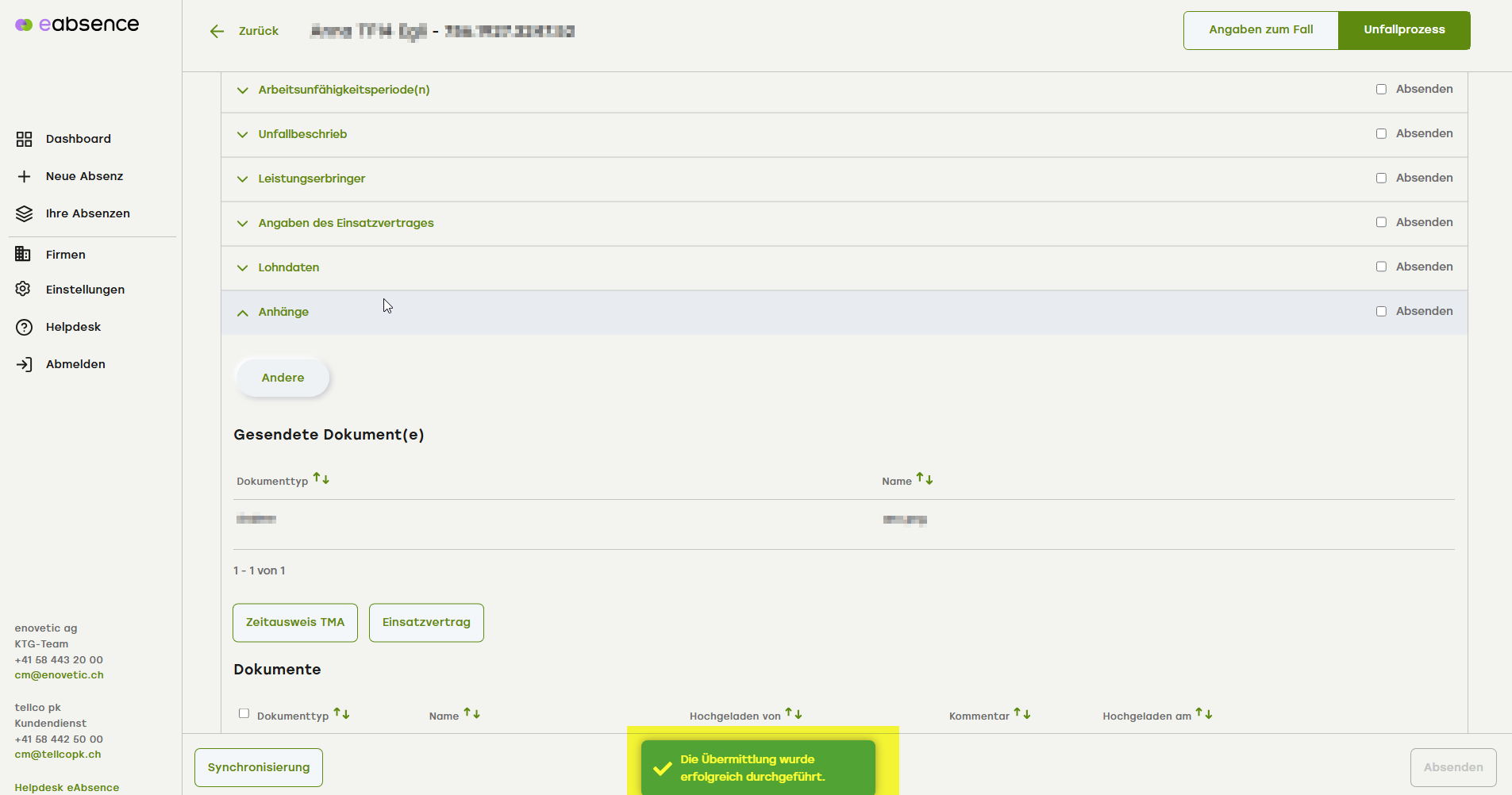 Nach erfolgreicher Übermittlung erhalten Sie unten in der Mitte am Bildschirm eine grüne Erfolgsmeldung.