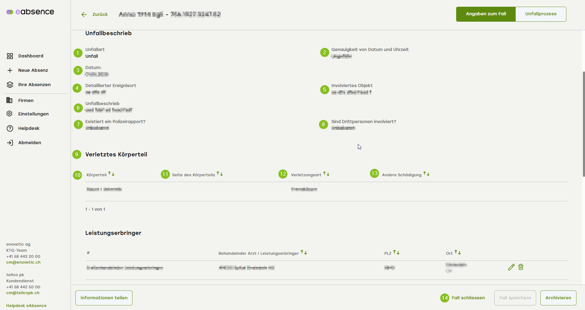 4. Unter den Informationen zur Absenz sehen Sie den Grund der Absenz (muss immer Unfall sein), den Bearbeitungsstand sowie der Art der Versicherungskasse