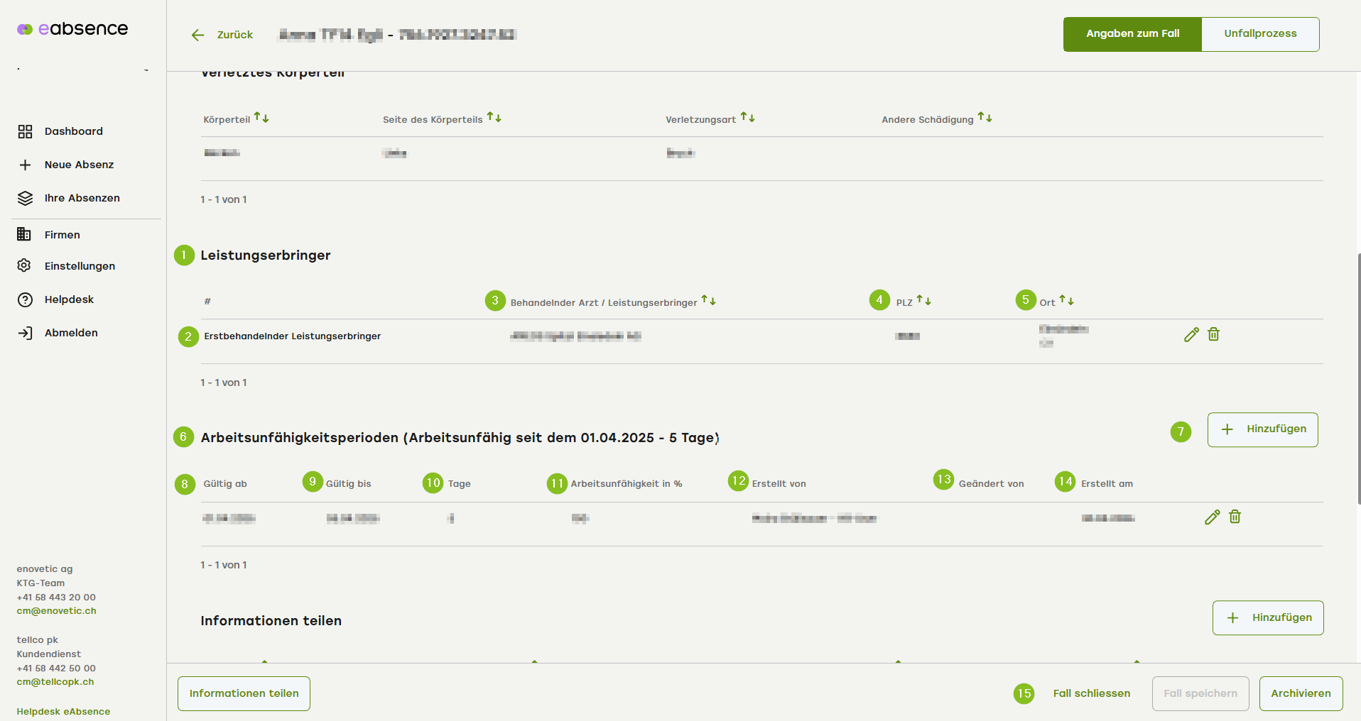 6. Zeigt die Arbeitsunfähigkeitsperiode mit den Angaben Beginn sowie der Anzahl Tage in der Übersicht.