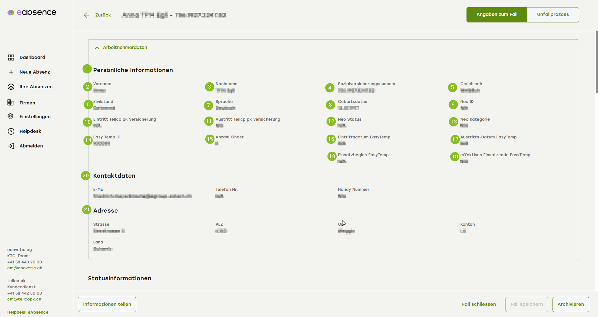 1. In den Angaben zum Fall finden Sie alle Angaben, die aus dem EasyTemp gezogen wurden oder durch Sie als USER erstellt worden sind.