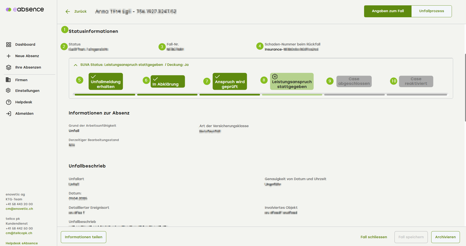 2. Hier ist der Status erneut ersichtlich, mit Angabe der Fall-Meldung an die SUVA.