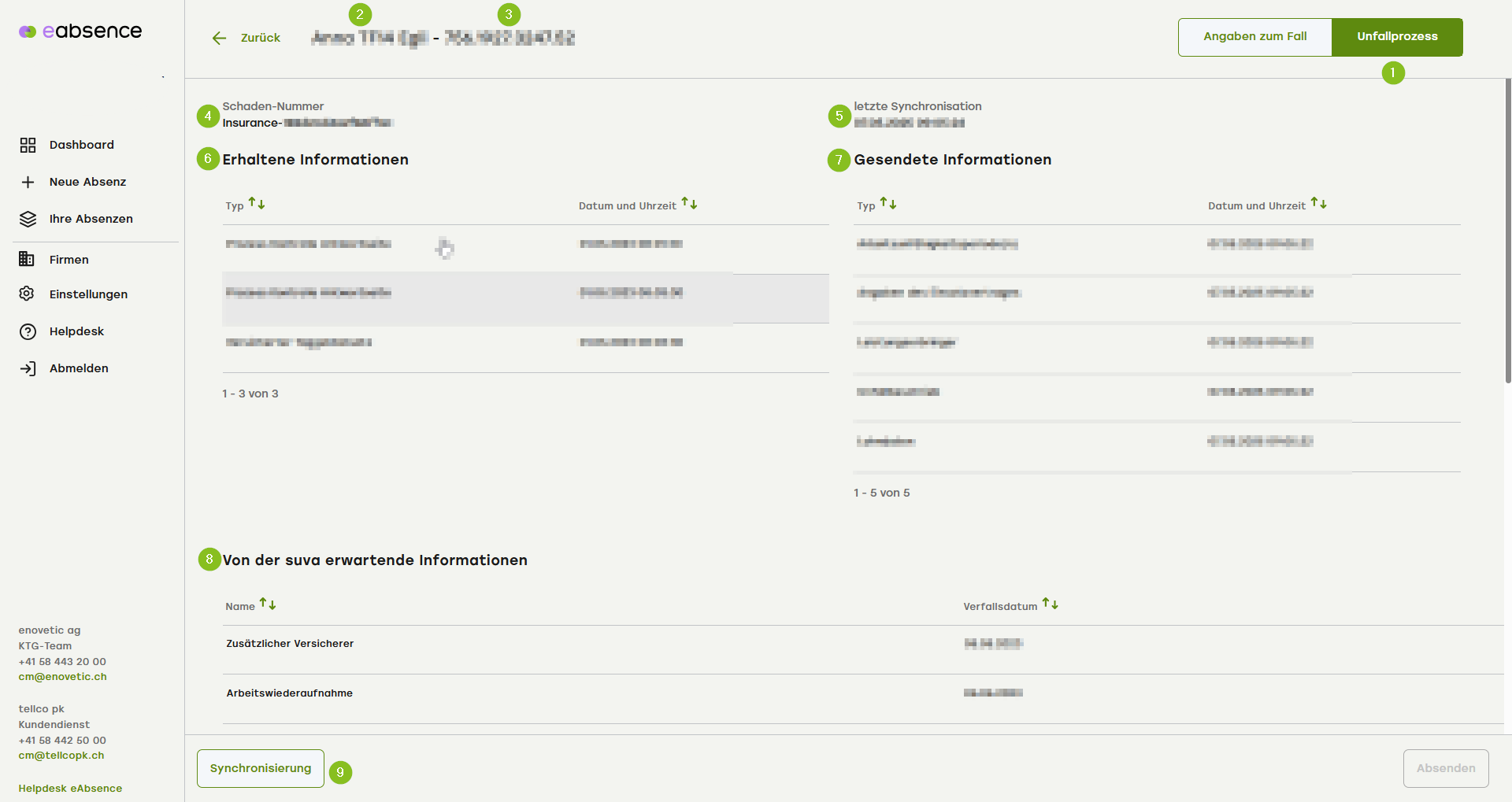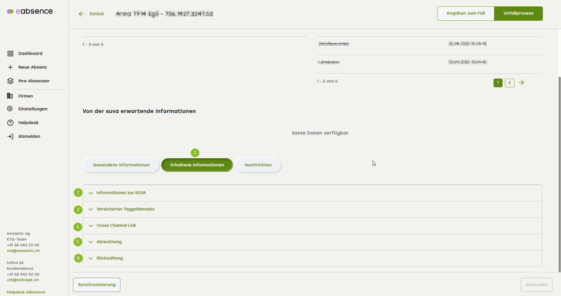 7. Gesendete Informationen: Alle Angaben, die Sie an die SUVA übermittelt haben, wie z. B. Details zum Fall, Einsatzvertrag, Zeitausweis und usw.