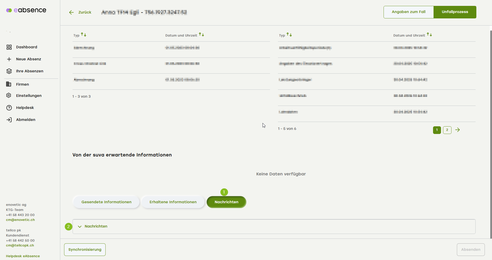 2. Nachrichten-Akkordeon-Menü: Nachrichten von der SUVA einsehen und an die SUVA übermitteln.