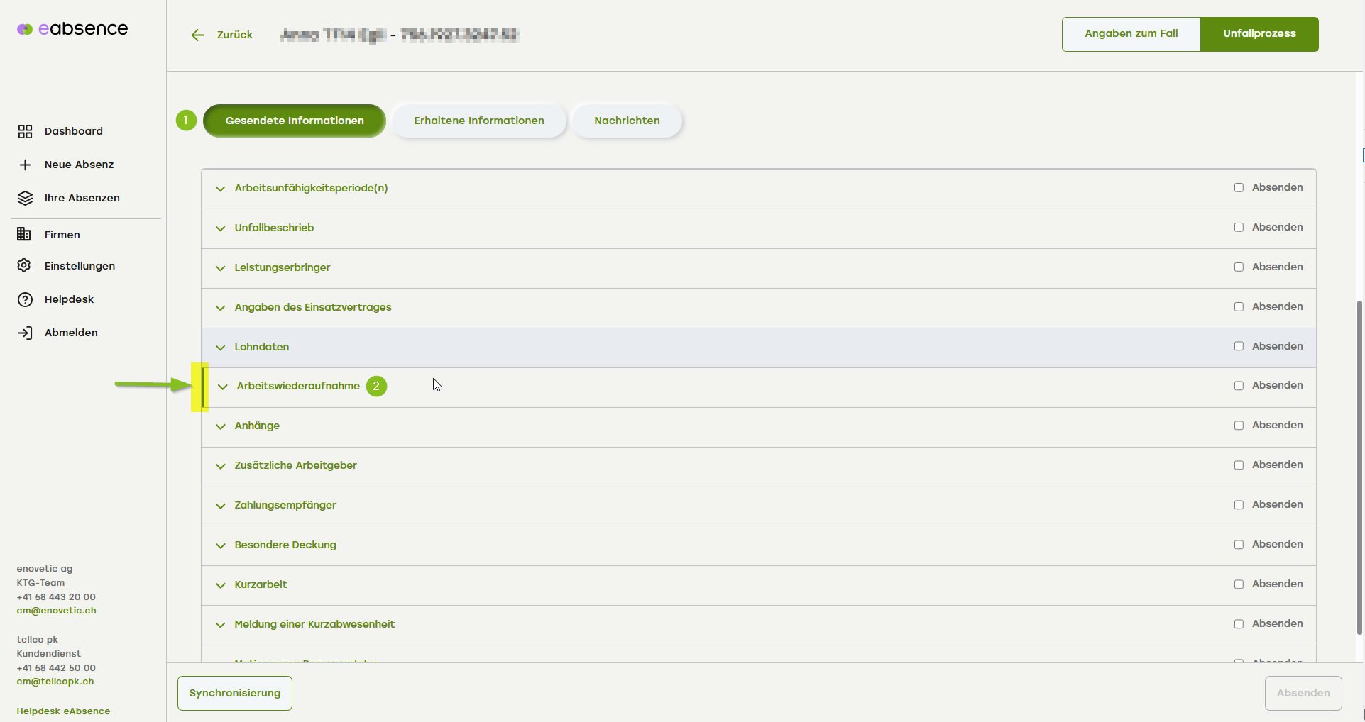 2. Ein Akkordeonmenüpunkt mit dem grünen Strich an der linken Seite weist Sie darauf hin, dass in diesem Menüpunkt eine Aktion von Ihrer Seite erforderlich ist und die entsprechende Information / Daten von der SUVA benötigt werden.