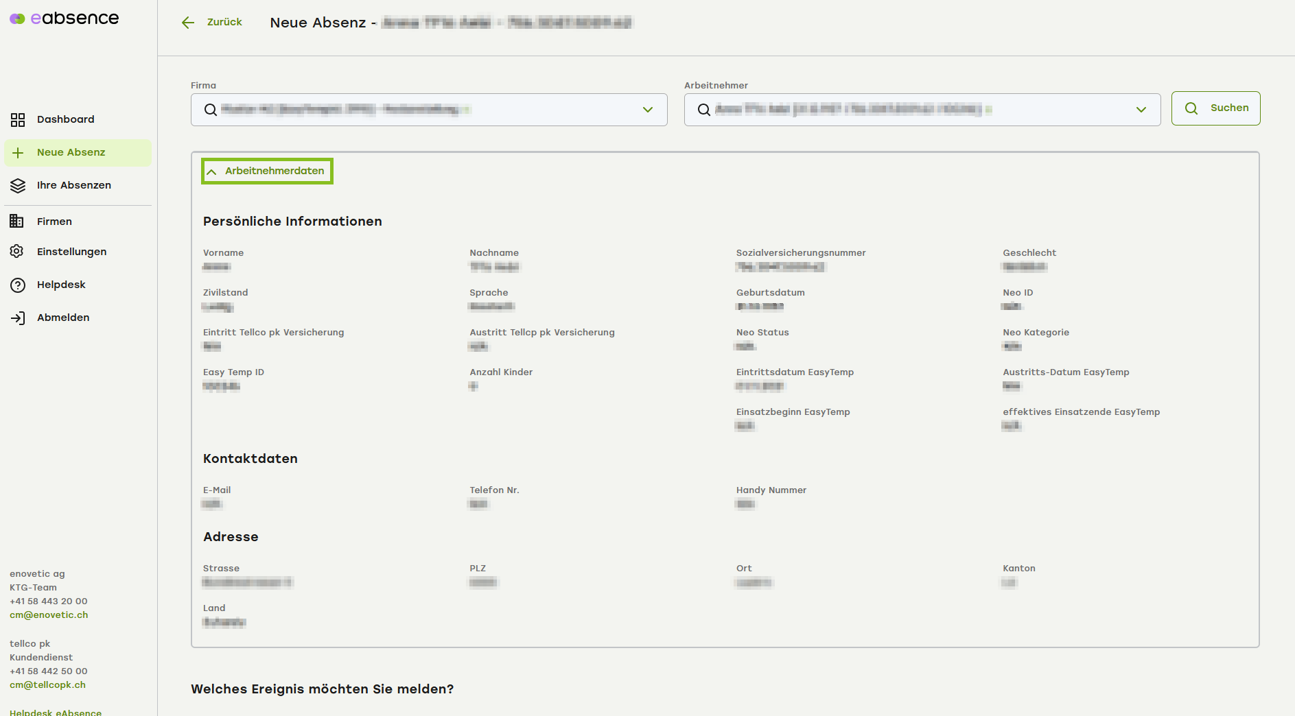 Wählen Sie rechts daneben den Arbeitnehmenden aus, für den Sie die Absenz erfassen möchten. Sie können entweder den Namen, die AHV-Nummer (Sozialversicherungsnummer) oder die TMA Nummer verwenden, um zu suchen.