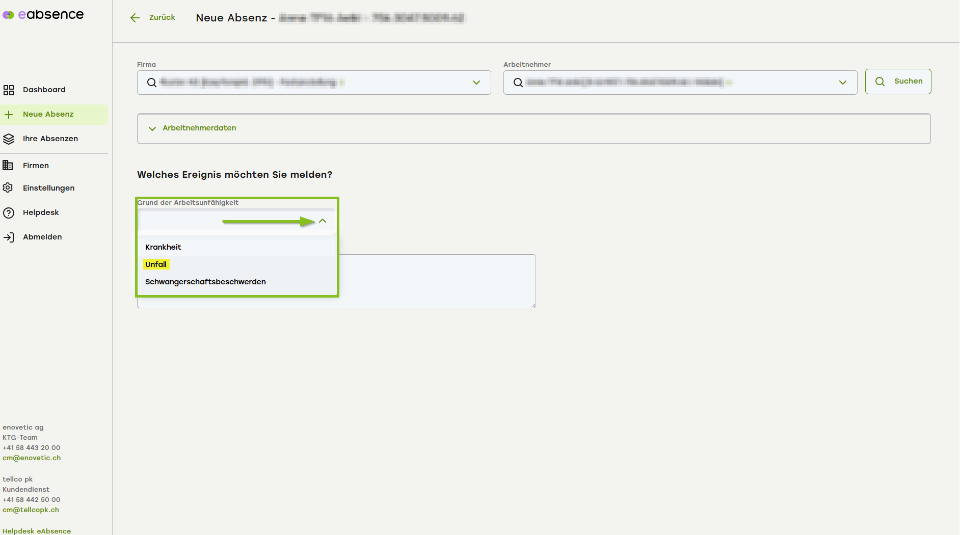 Geben Sie an, welche Art von Absenz Sie erfassen möchten, in diesem Beispiel Unfall.