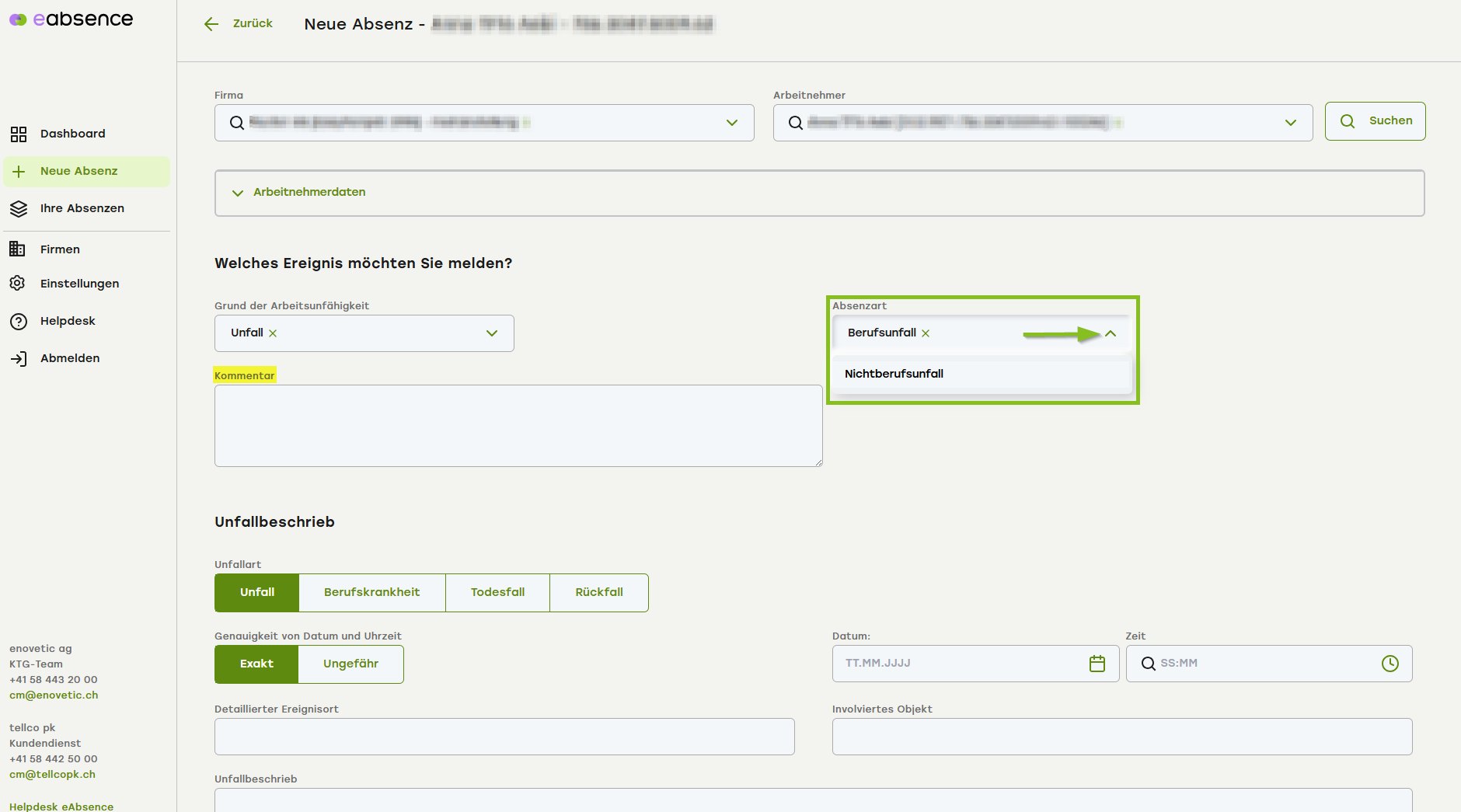 Wählen Sie aus, ob es sich um einen Berufsunfall oder Nichtberufsunfall handelt und erfassen Sie im Kommentarfeld allfällige Anmerkungen & Präzisierungen.