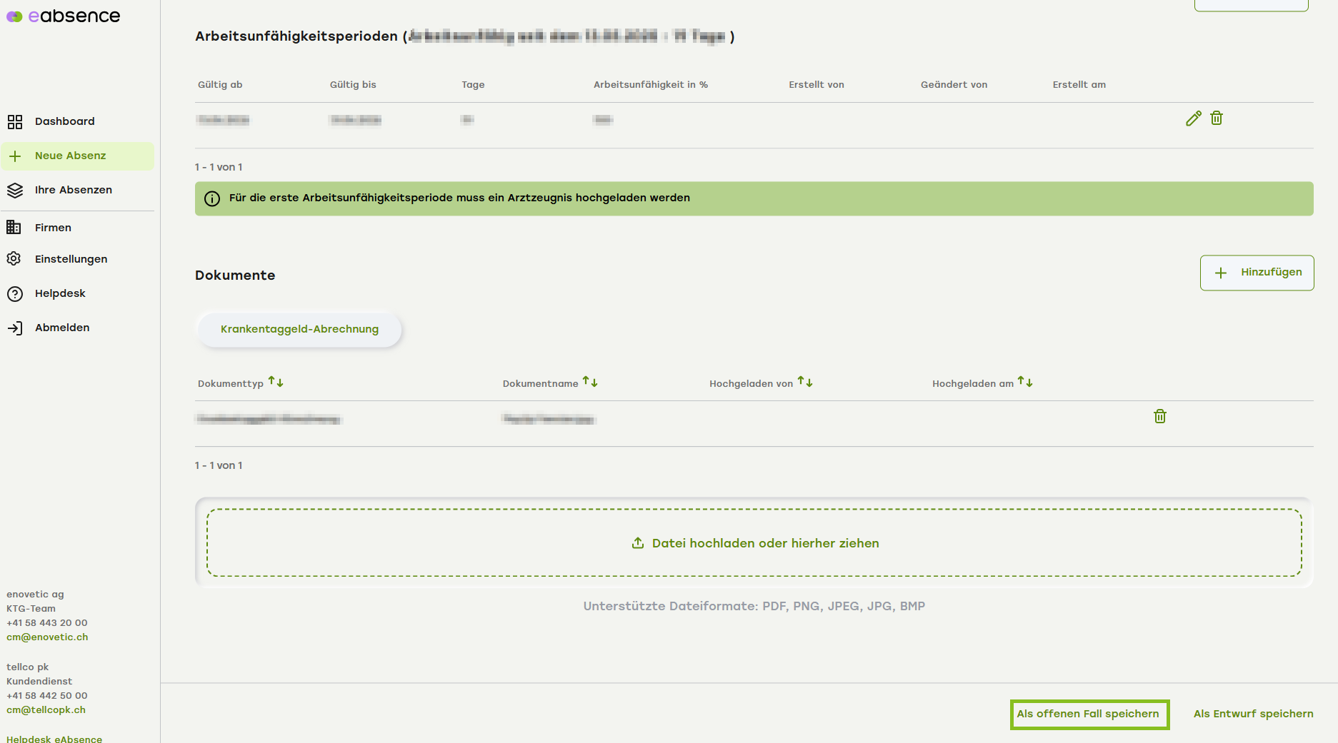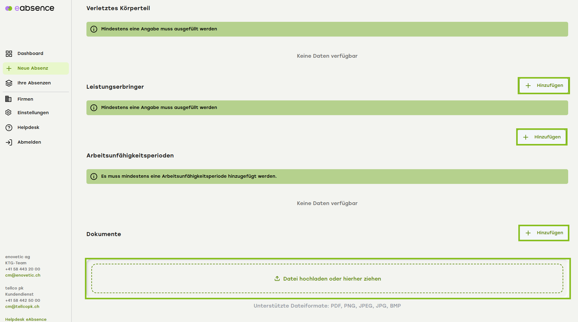 Erfassen Sie jetzt alle relevanten Dokumente. Sie können eine Datei oder mehrere Dateien gleichzeitig aus Ihrem Dateimanager direkt per drag&drop hereinziehen oder auf «Datei hochladen» klicken. Unterstützte Dateiformate: PDF, PNG, JPEG, JPG, BMP.