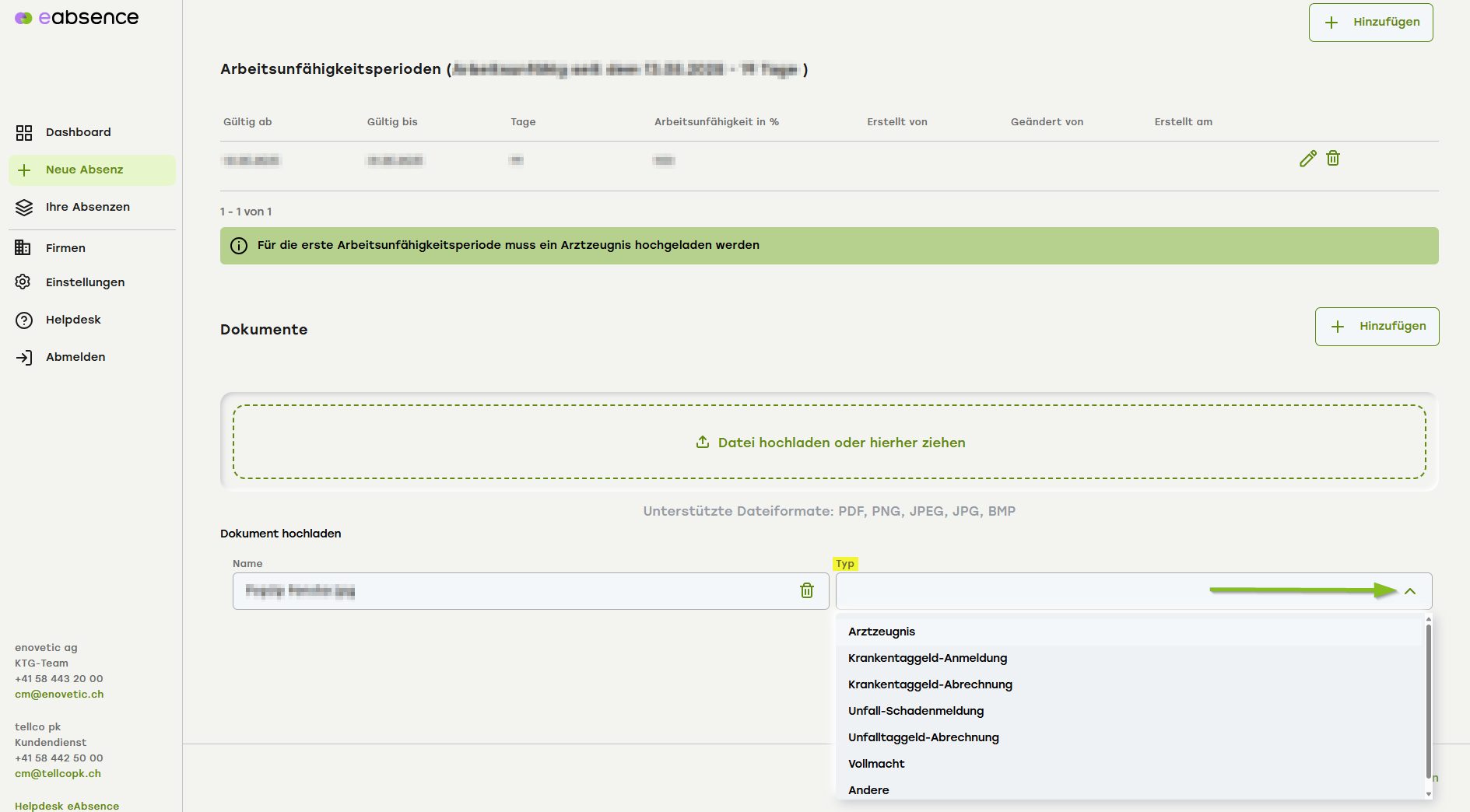 Laden Sie die Dateien hoch und wählen Sie aus, um welche Art Dokument es sich handelt (rechte Spalte). In der linken Spalte können Sie die Dateien bei Bedarf noch umbenennen, zur besseren Übersichtlichkeit. Beenden Sie den Vorgang mit «Hinzufügen».