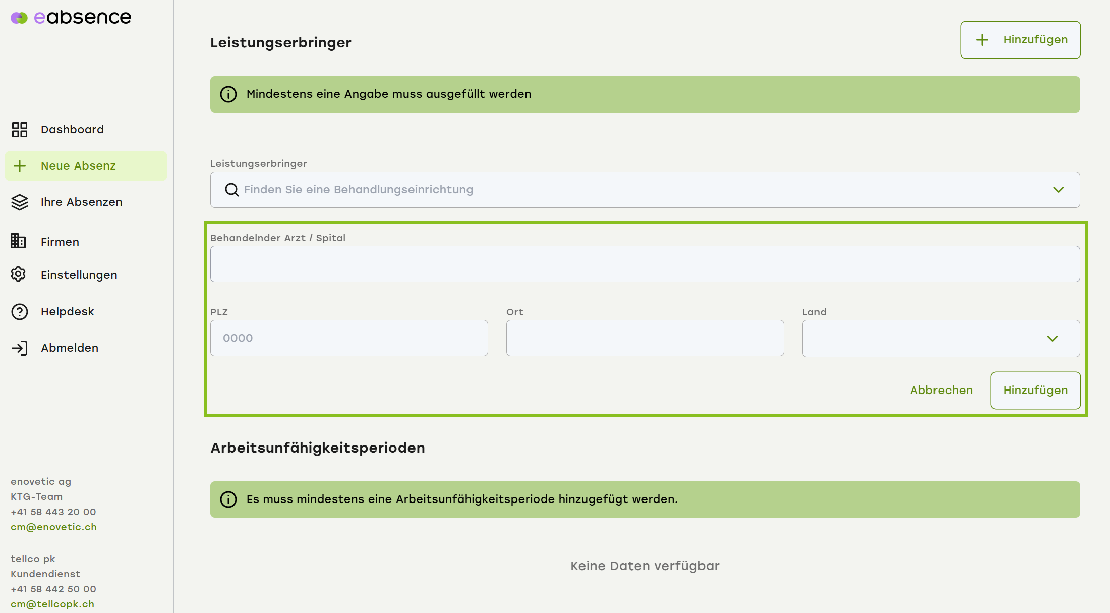 Wenn sich der Leistungserbringer im Ausland befindet, können Sie dies manuell eingeben.