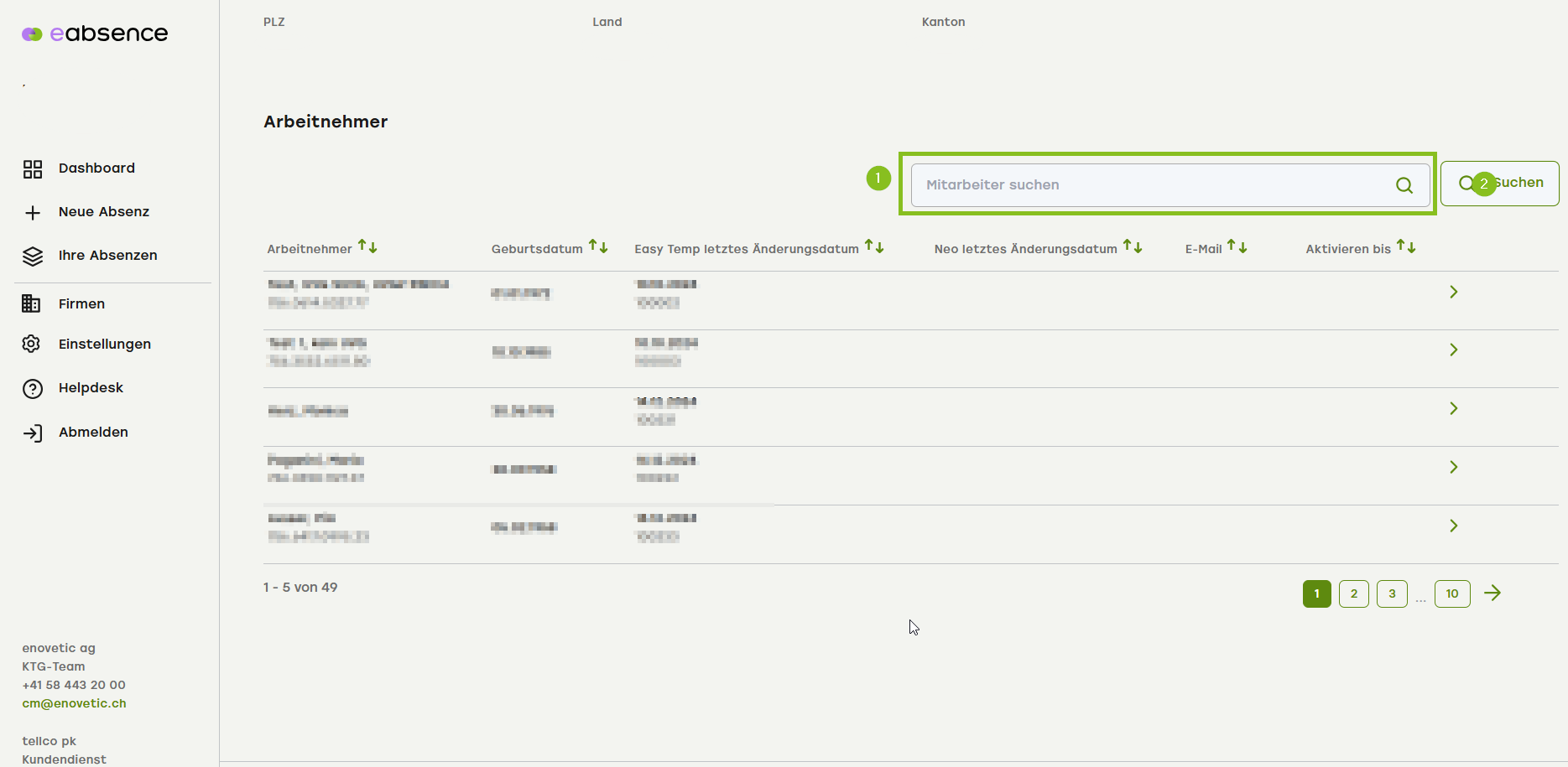 4. Die Detailansicht dieser Firma wird geöffnet. Scrollen Sie nach unten, bis Sie den Abschnitt mit den Mitarbeitenden der Firma sehen. Suchen Sie in der Suchleiste (1), Sie können mit dem Namen, Vornamen, AHV-Nummer oder easytemp-ID suchen. Um zu Suchen klicken Sie auf den Suchknopf mit der Lupe (2).