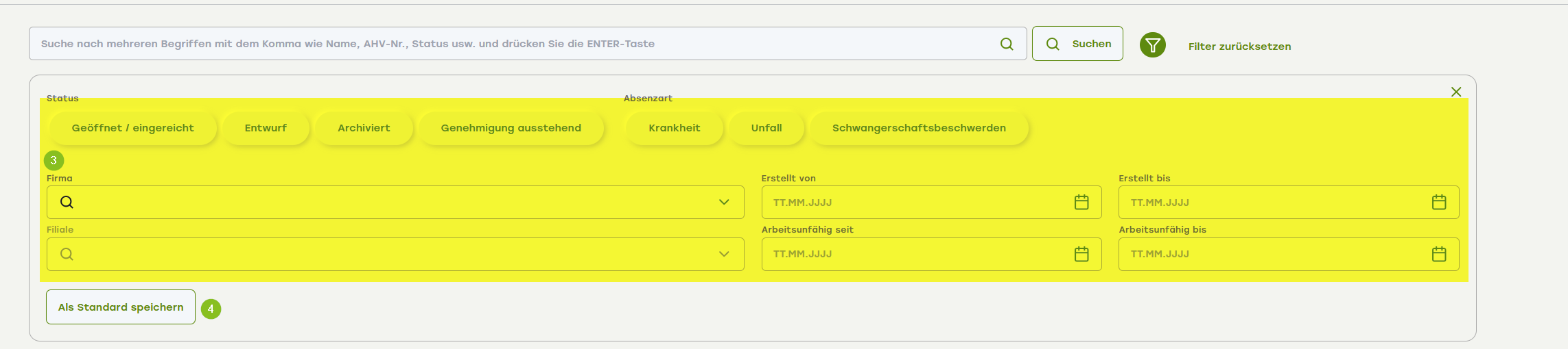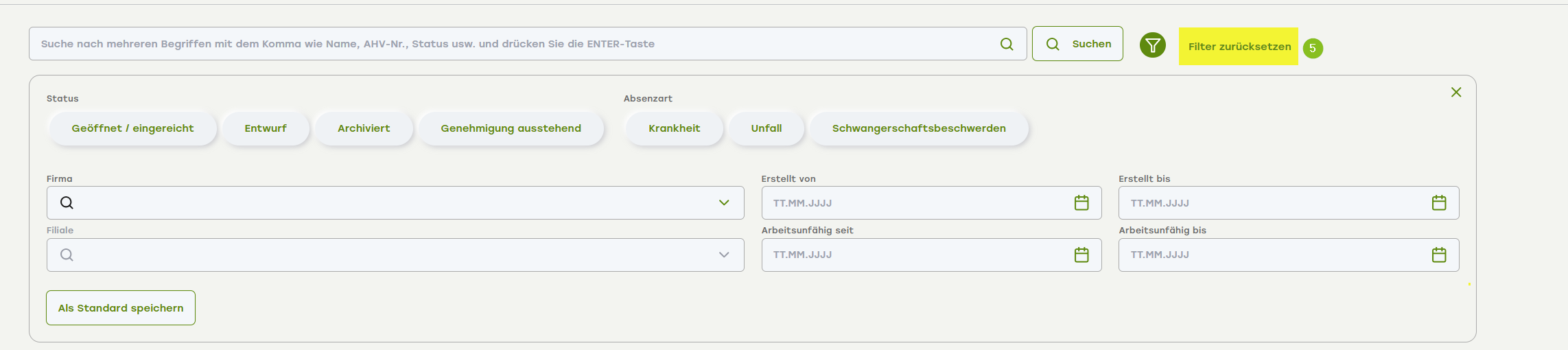 - Wenn Sie eine Filterung als Voreinstellung für die Suche in «Alle Absenzen» verwenden möchten, klicken Sie auf den Knopf «Als Standard» speichern.