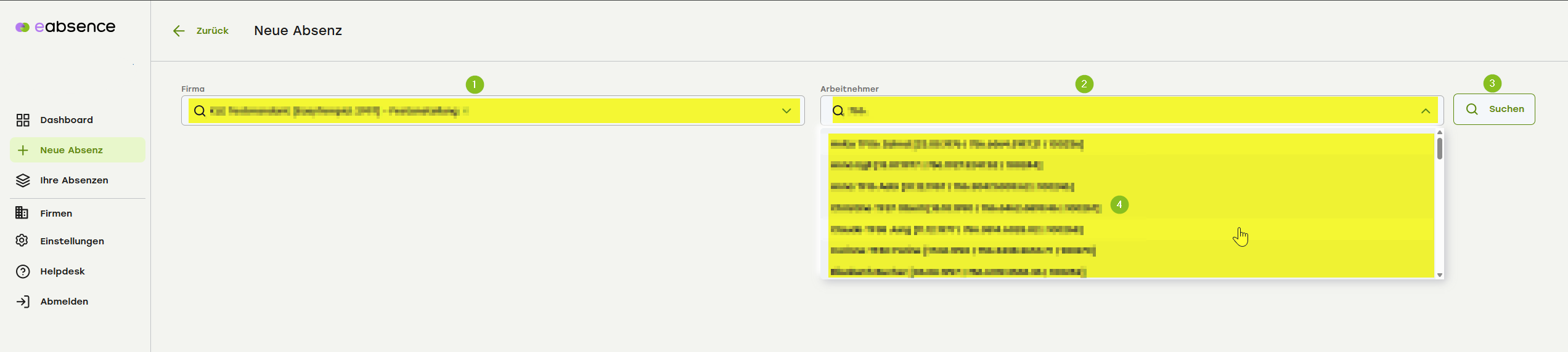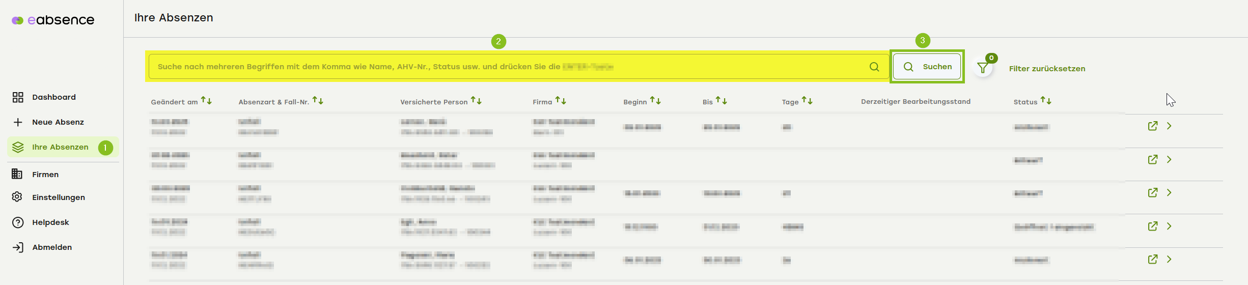 Wenn Sie in eAbsence eine Suche nach Fällen, Angestellten oder Verträgen durchführen, ist es wichtig, dass Sie immer auf den «Suchen» Knopf klicken, damit die Suche durchgeführt wird.