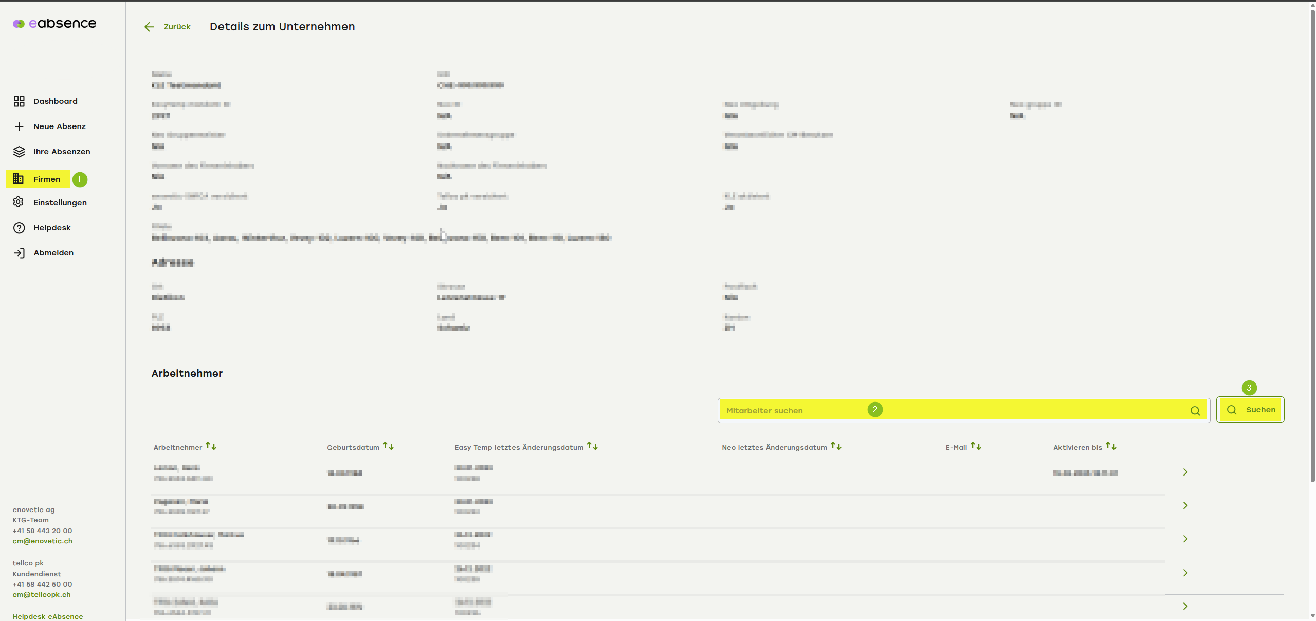- In der Suchleiste geben Sie den Firmennamen, die easytemp Mandantennummer oder die tellco pk Vertragsnummer ein und drücken Sie die «Enter»-Taste.