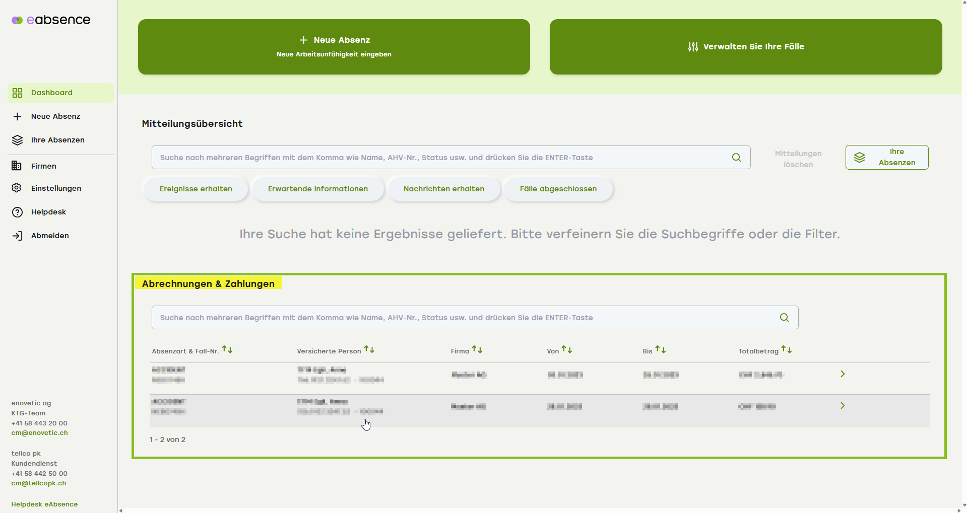 Klicken Sie auf die entsprechende Abrechnung (1), um die Details einzusehen. Sie können über die Suchleiste (2) nach einer bestimmten Abrechnung suchen.