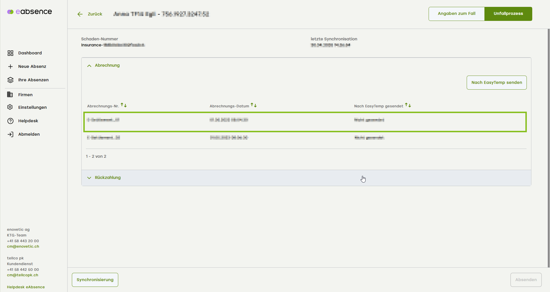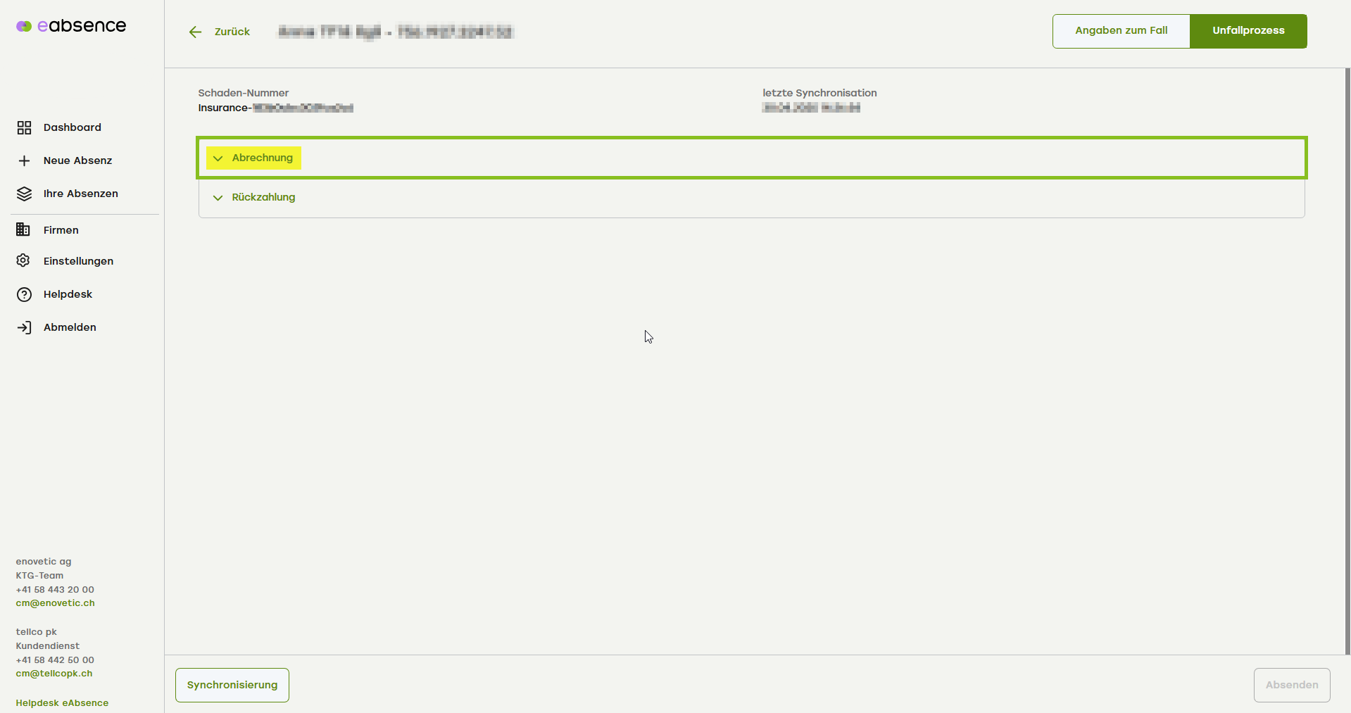 Sie werden weitergeleitet in die Ansicht «Unfallprozess» des entsprechenden Falls. Klicken Sie auf das Akkordeonmenü «Abrechnung», um die Abrechnungen zu sehen.