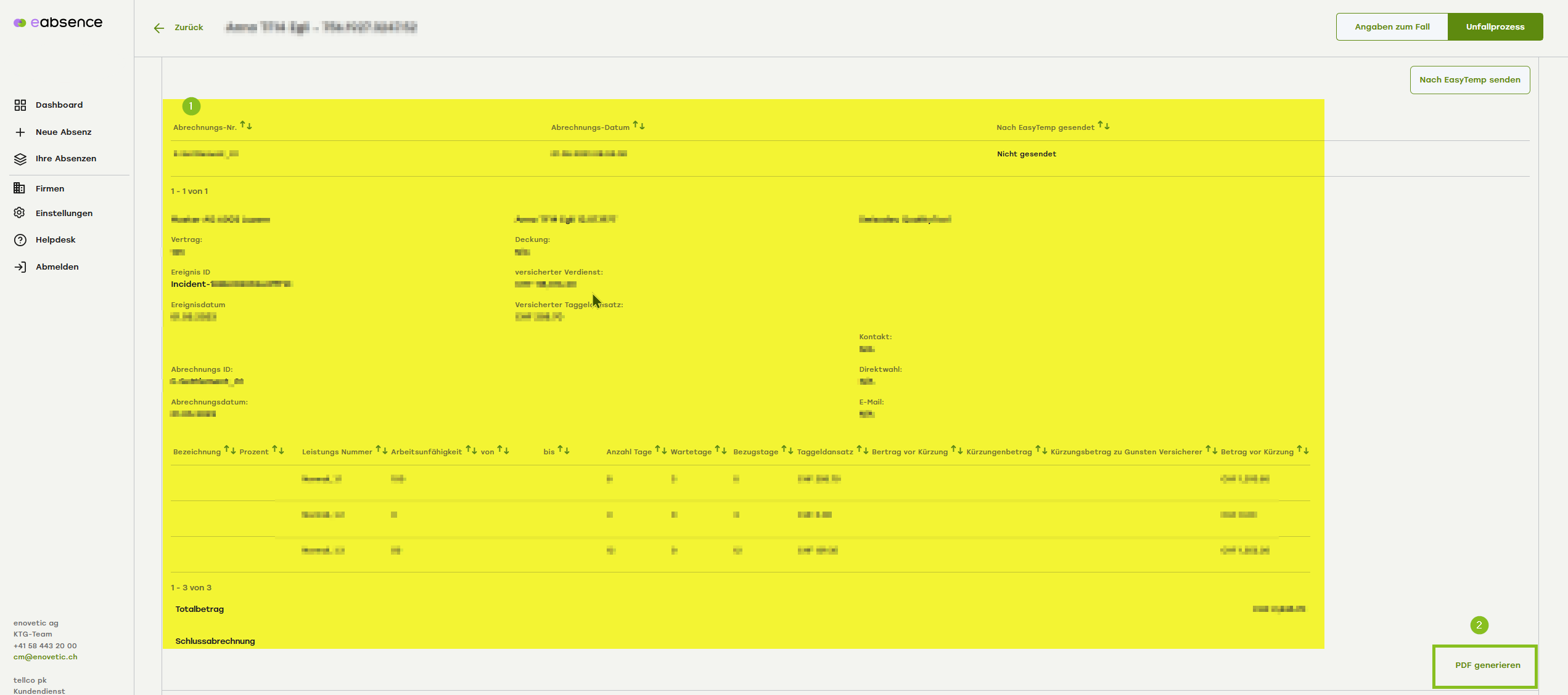 Möchten Sie die Abrechnung als PDF abrufen, klicken Sie auf «PDF Generieren» (2).
