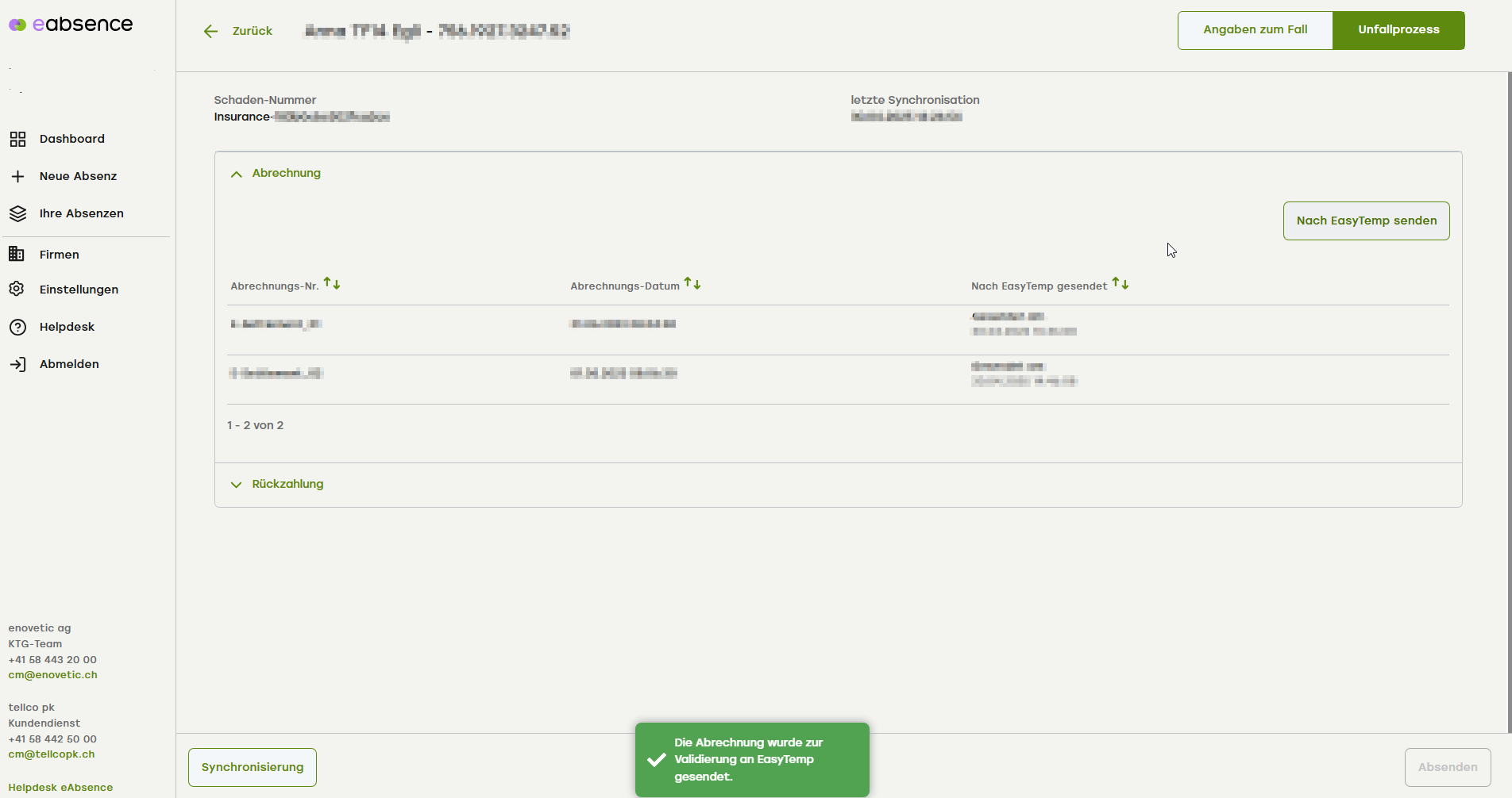 Sie erhalten die grüne Meldung: «Die Abrechnung wurde zur Validierung an EasyTemp gesendet.»