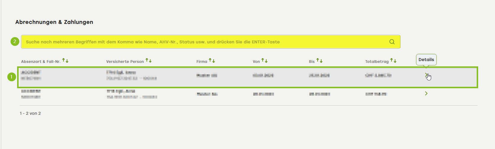 Sie können über die Suchleiste (2) nach einer bestimmten Abrechnung suchen.