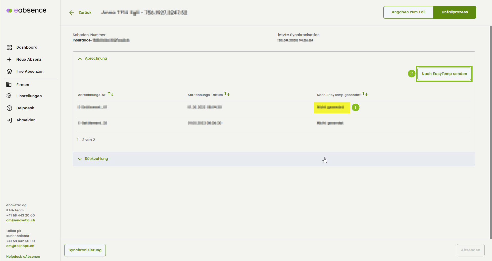 Um die Abrechnungen zu übermitteln, klicken Sie auf den Knopf «Nach EasyTemp» (2) senden.