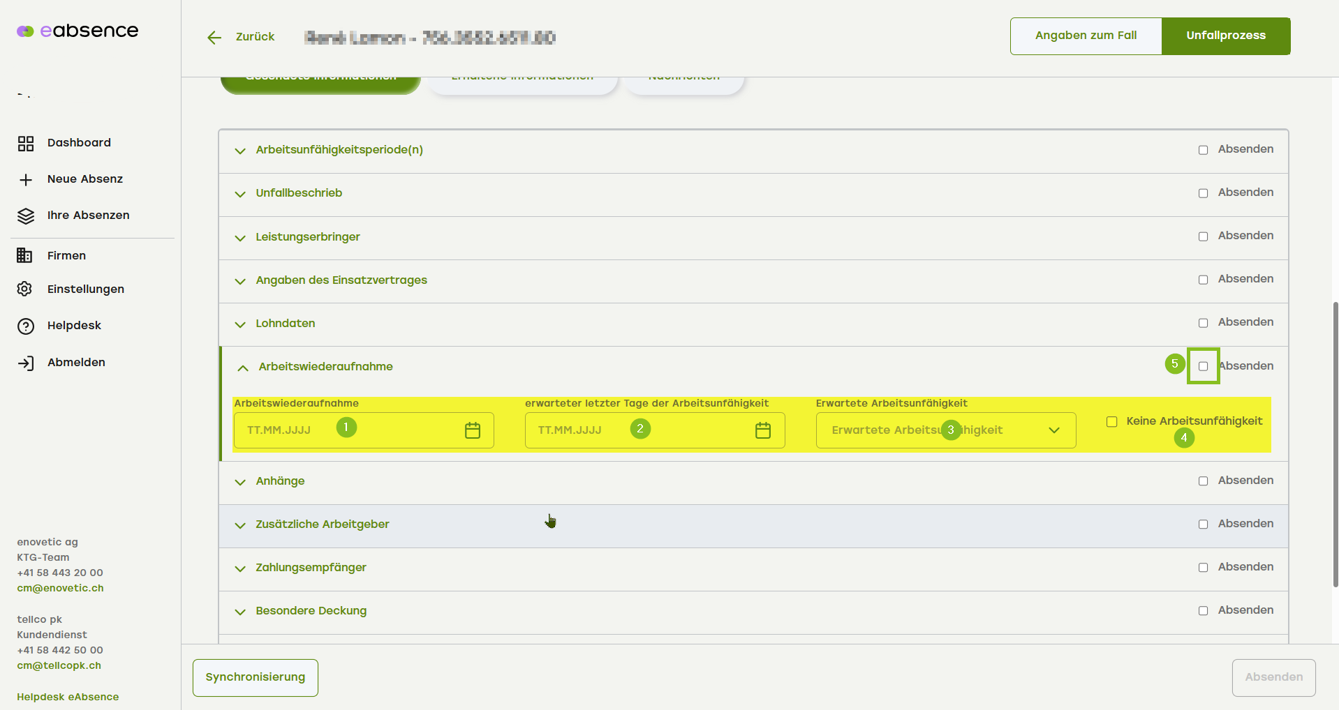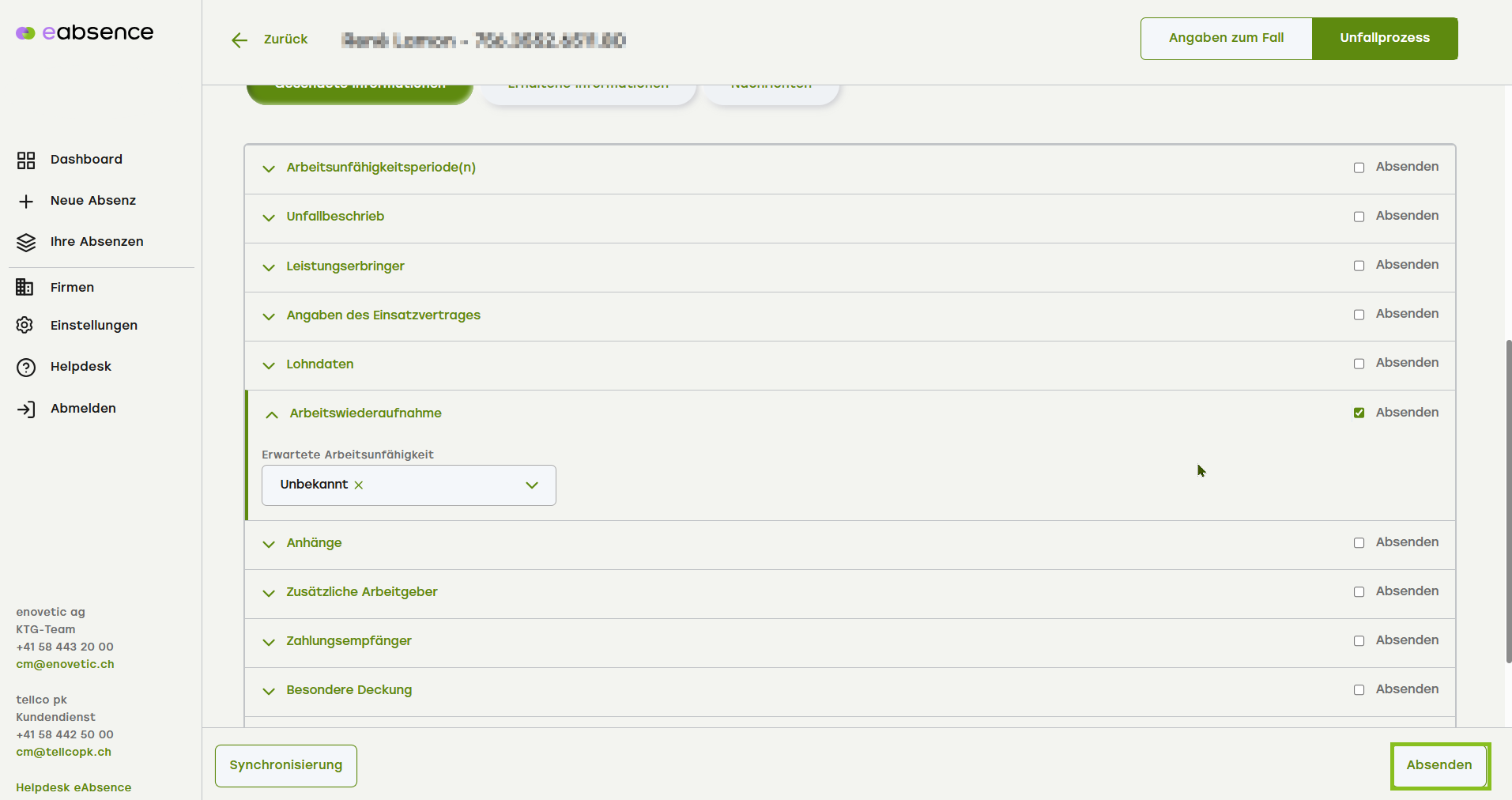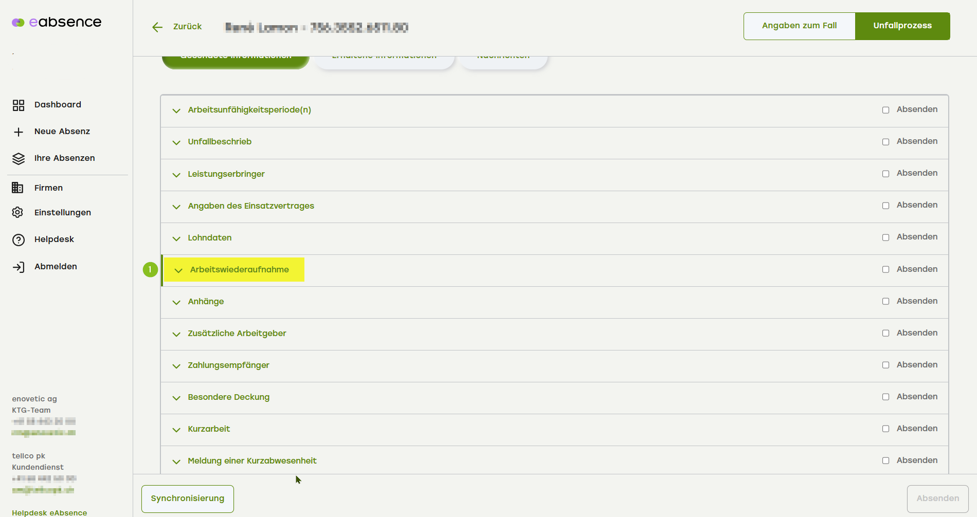 - Nachdem Sie den Knopf «Gesendete Informationen» aktiviert haben, scrollen Sie bitte nach unten bis zum Akkordeonmenüpunkt «Arbeitswiederaufnahme».