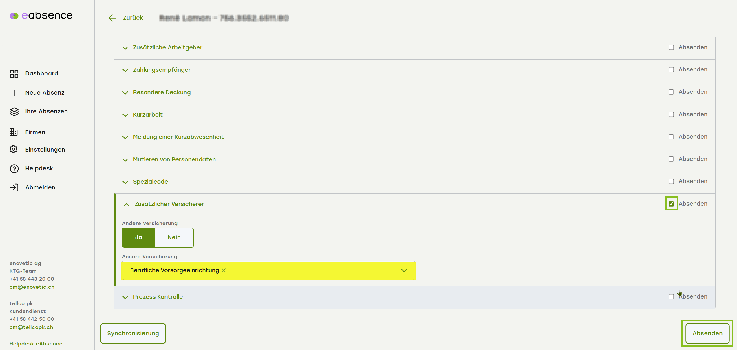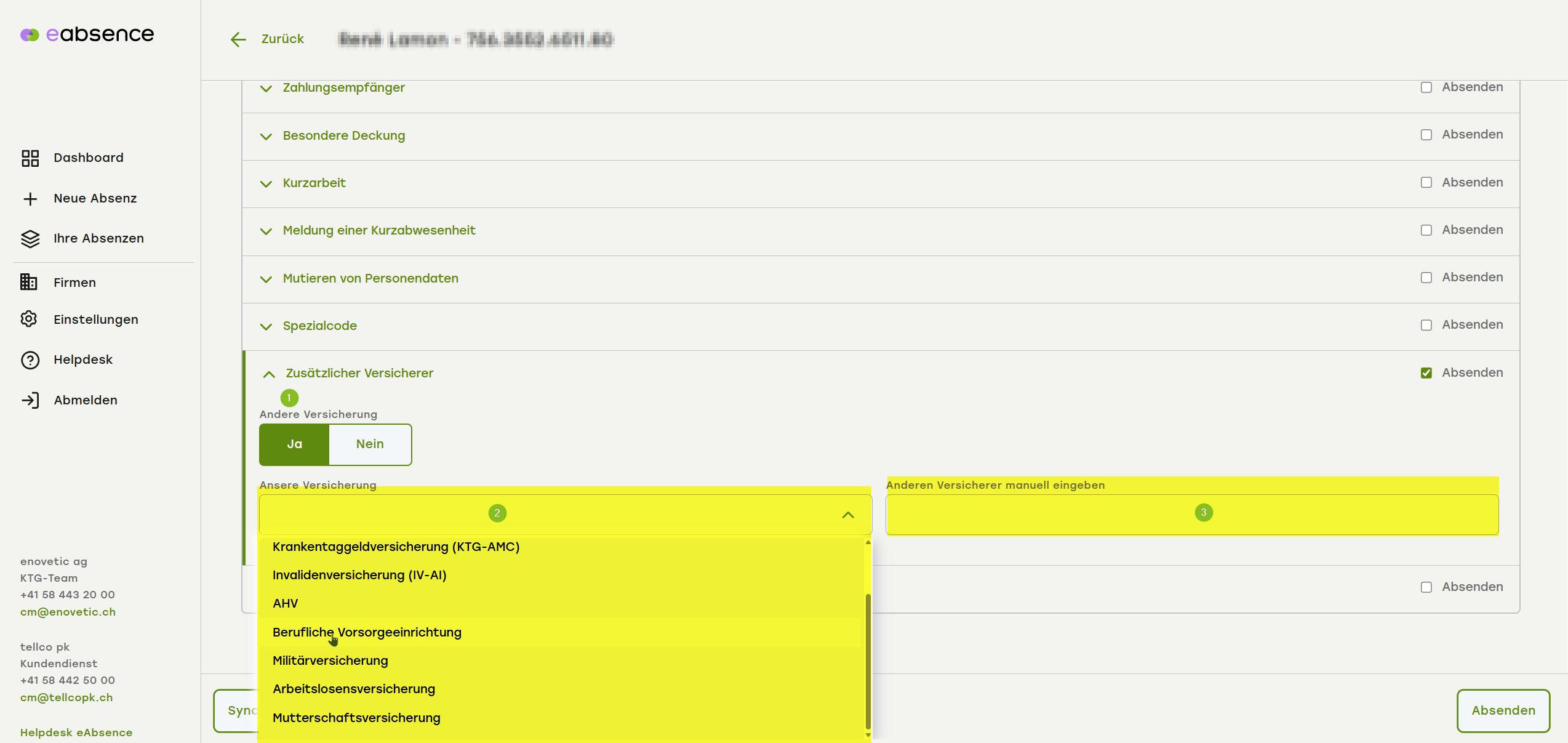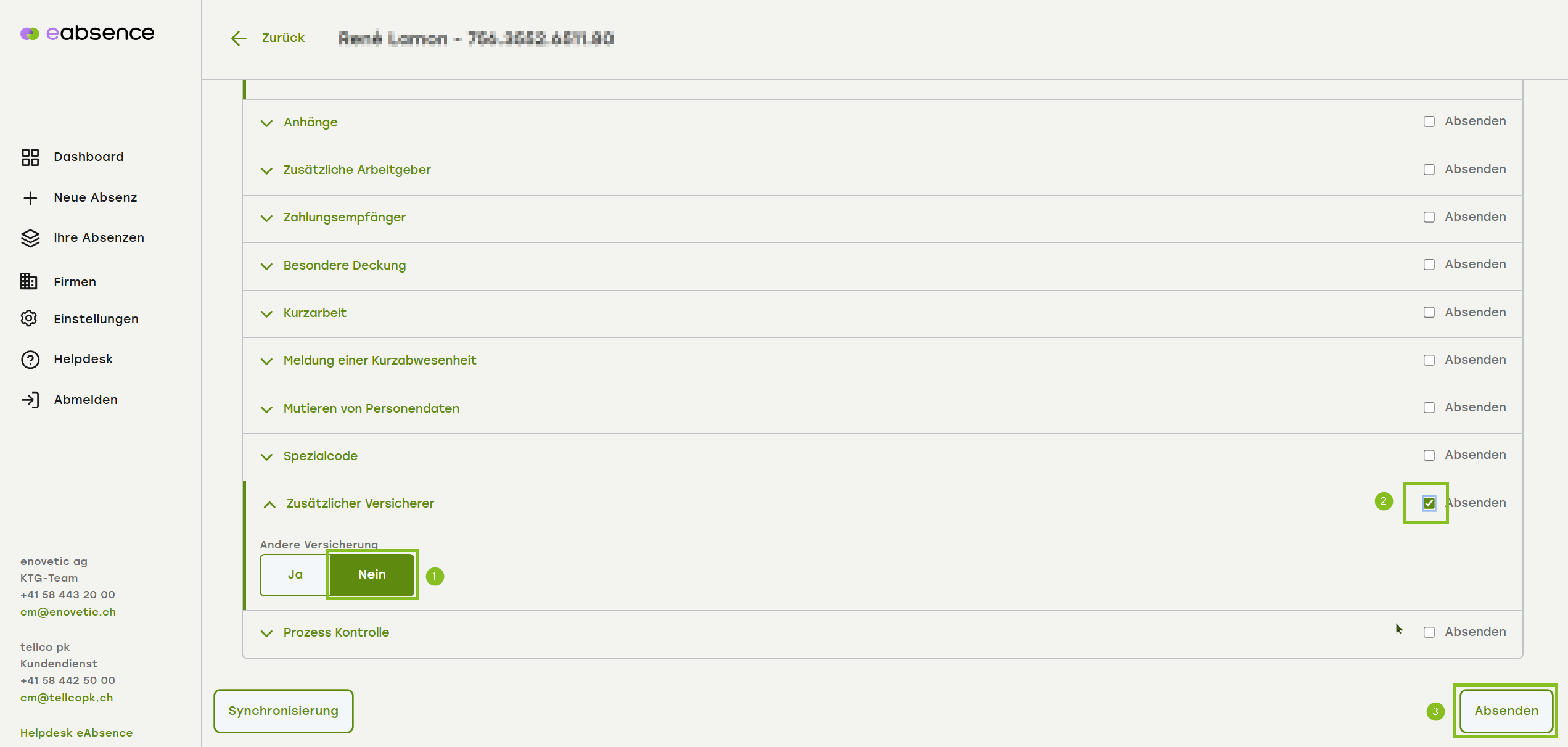 Gibt es keinen zusätzlichen Versicherer, wählen Sie die Schaltfläche «Nein» (1), setzen Sie den Haken bei «Absenden» (2) und klicken unten rechts auf Knopf «Absenden»