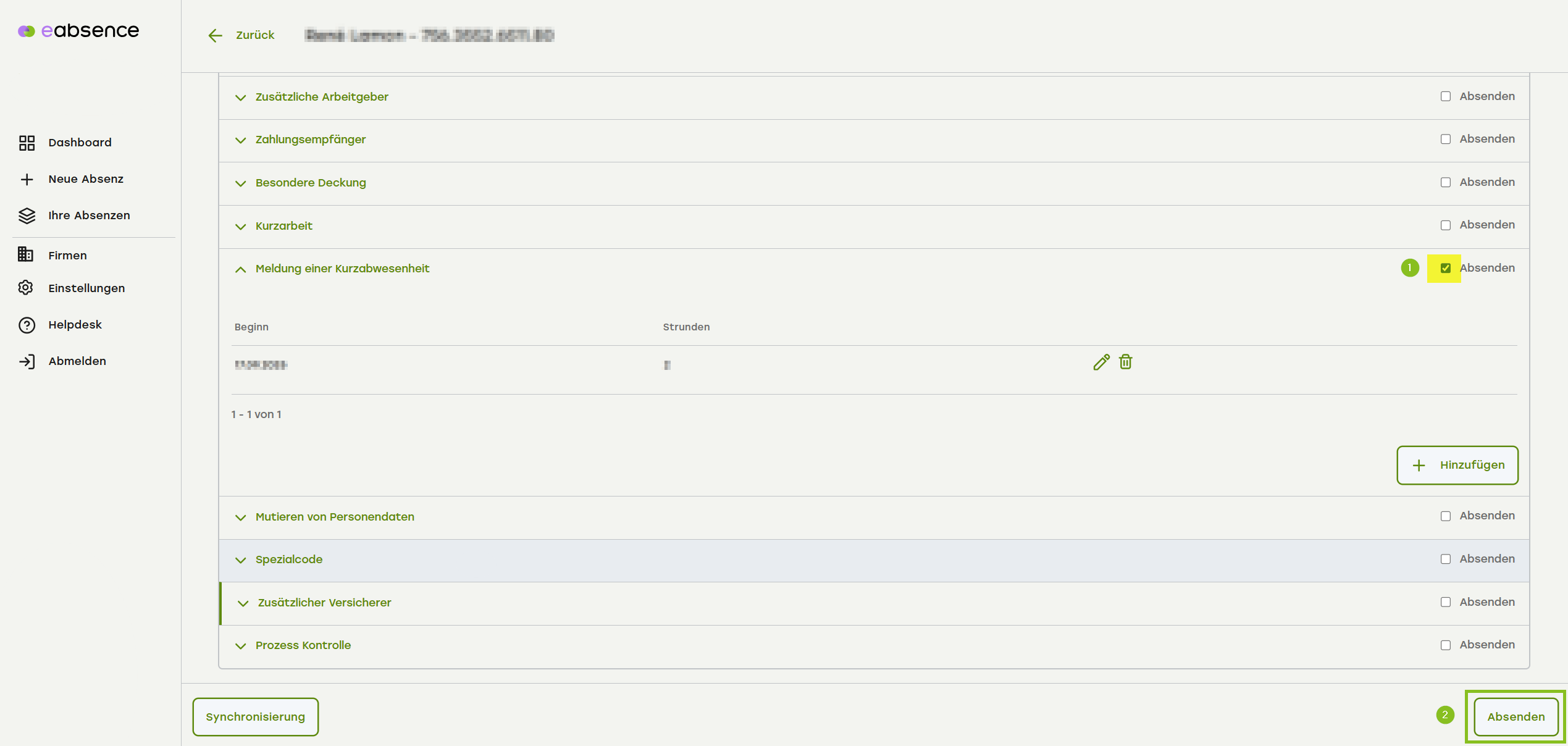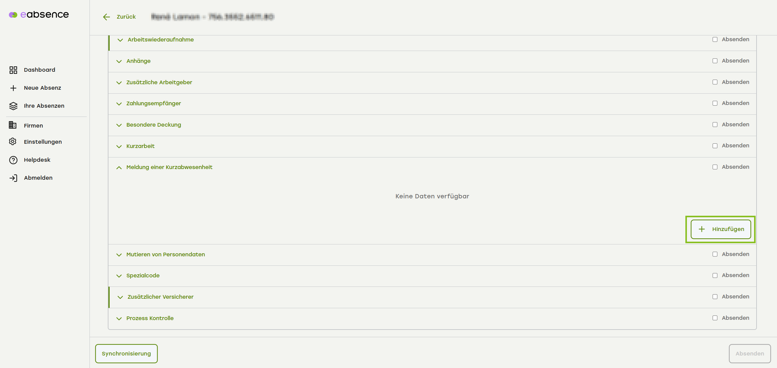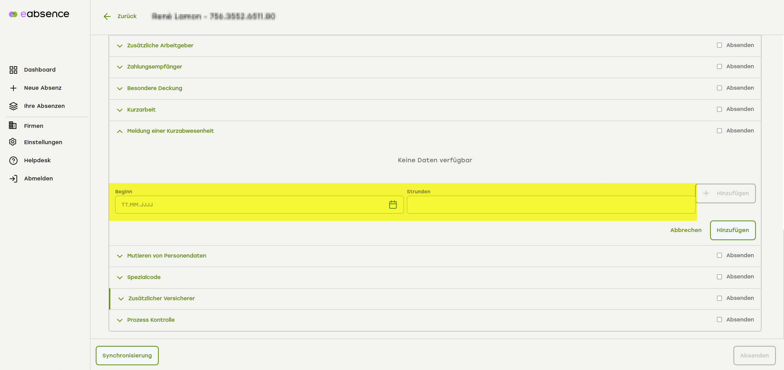 - Klappen Sie den Menüpunkt «Kurzabsenz» auf.