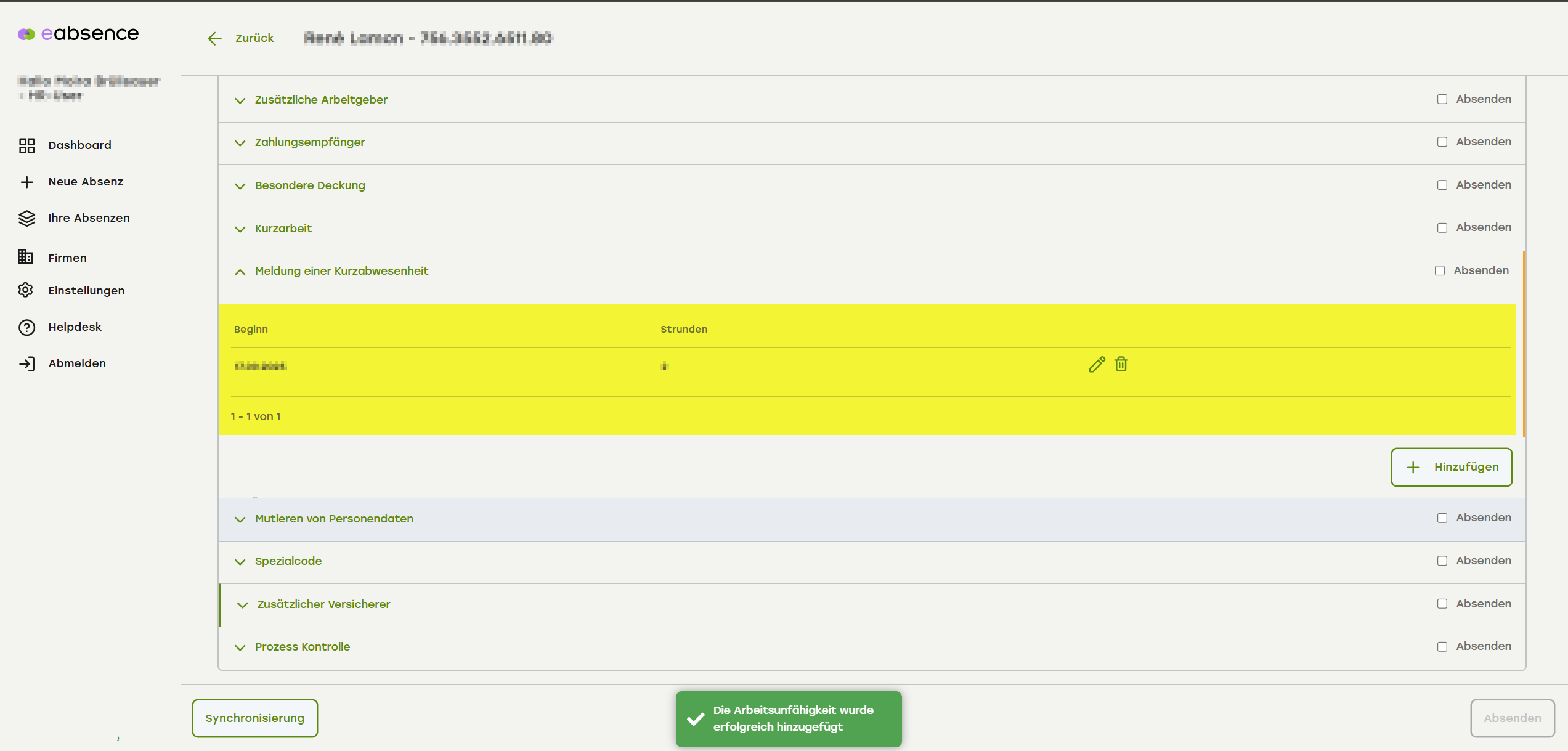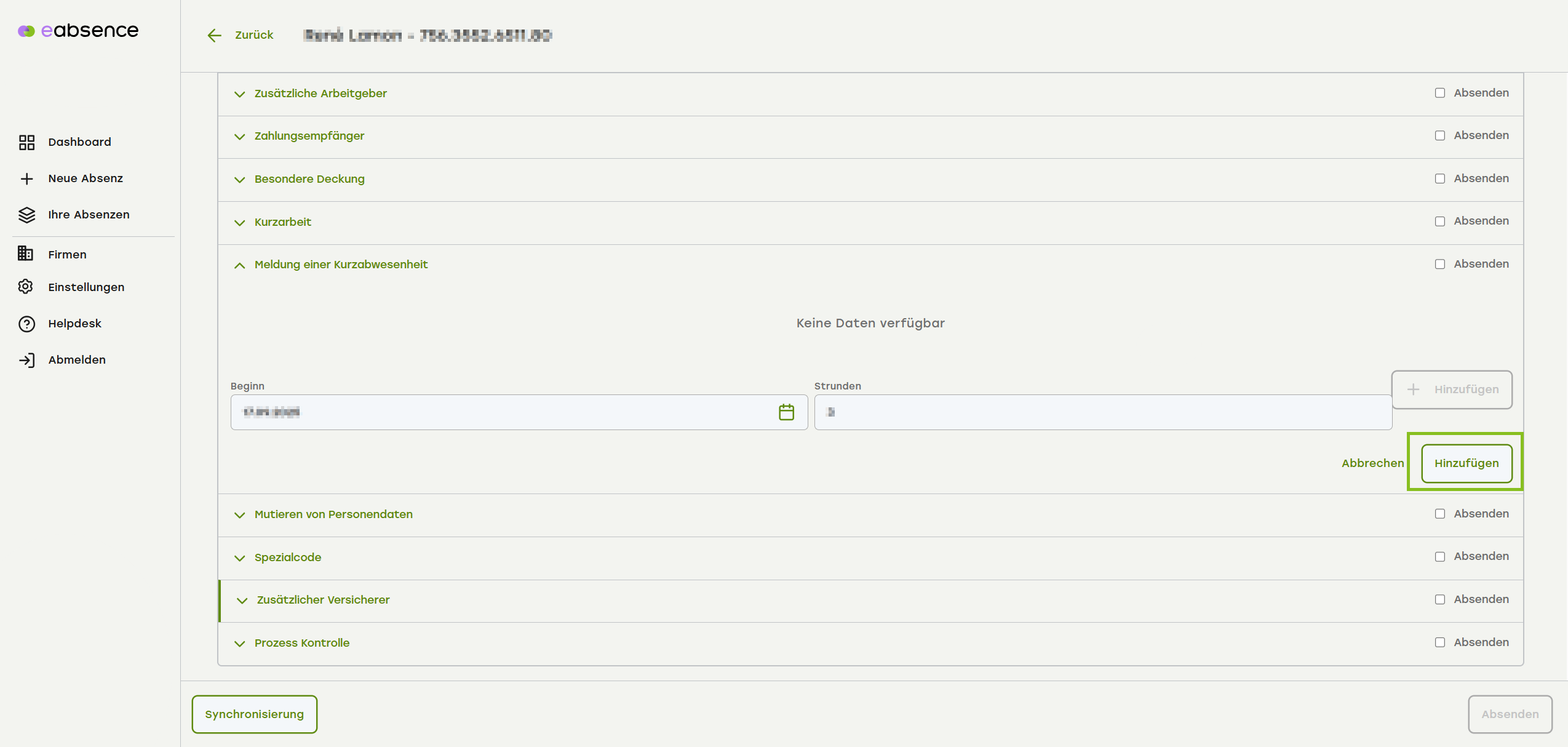 Um eine Kurzabwesenheit zu erfassen, klicken Sie auf «Hinzufügen».