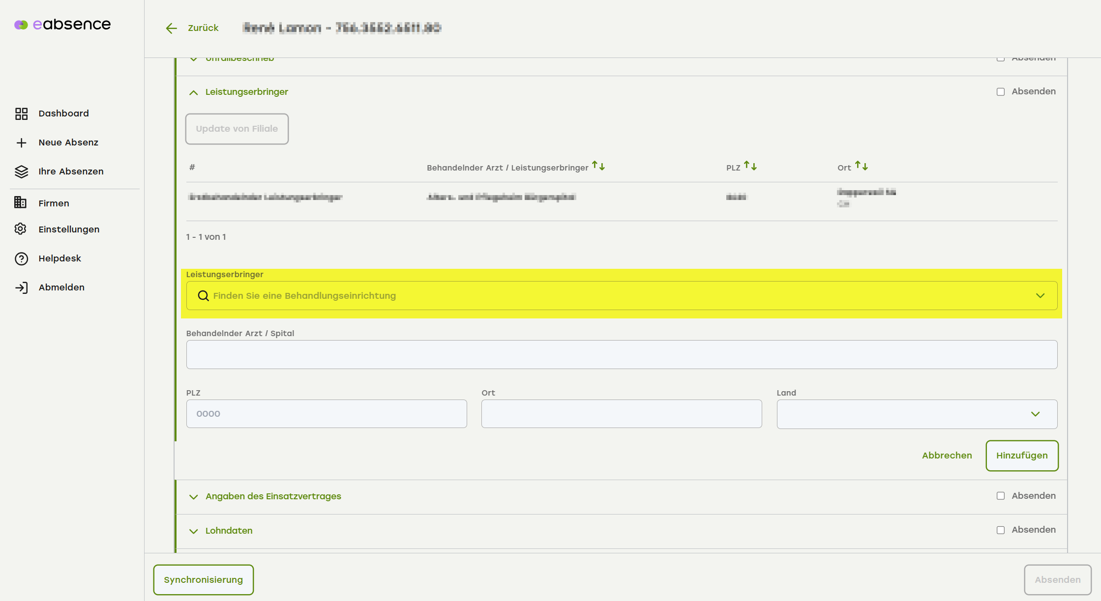 1. Klicke auf hinzufügen, um einen neuen Leistungserbringer zu erfassen.