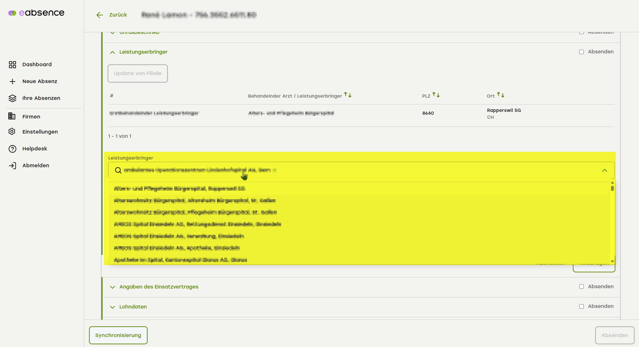 Aus der Dropdownliste können Sie den passenden Leistungserbringer auswählen.