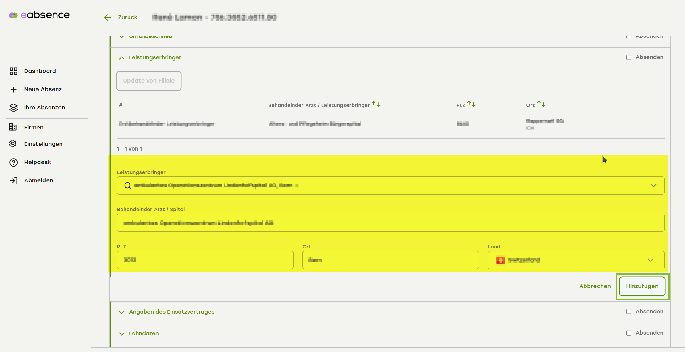 Kontrollieren Sie die Angaben zum Leistungserbringer und klicken Sie auf «Hinzufügen».