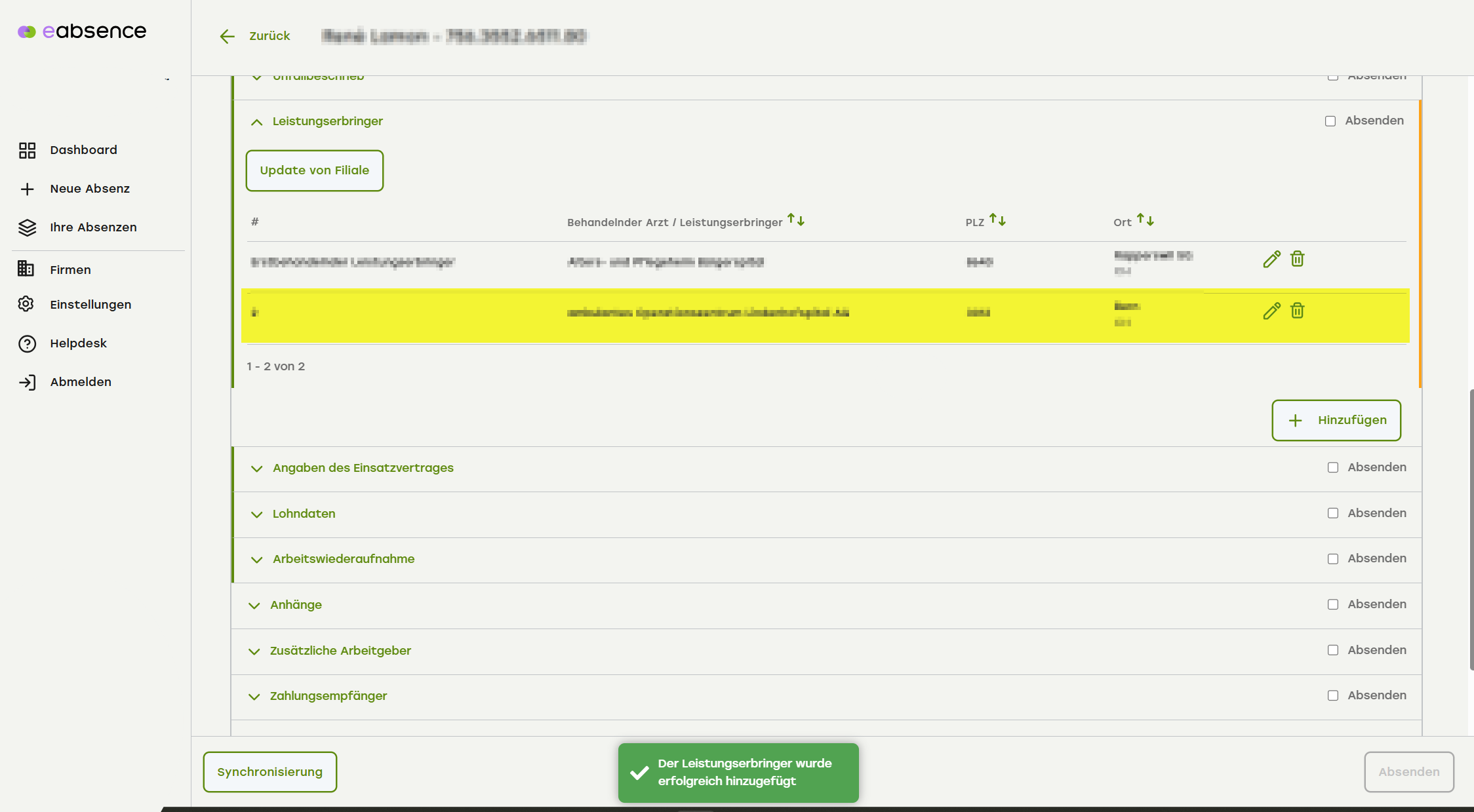 Der Leistungserbringer wurde erfolgreich hinzugefügt.