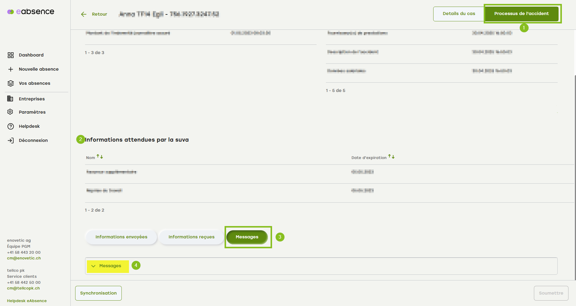 Dans le menu accordéon « Messages » déplié, vous voyez tous les messages reçus de la SUVA et ceux que vous avez envoyés. Vous pouvez les lire ici.