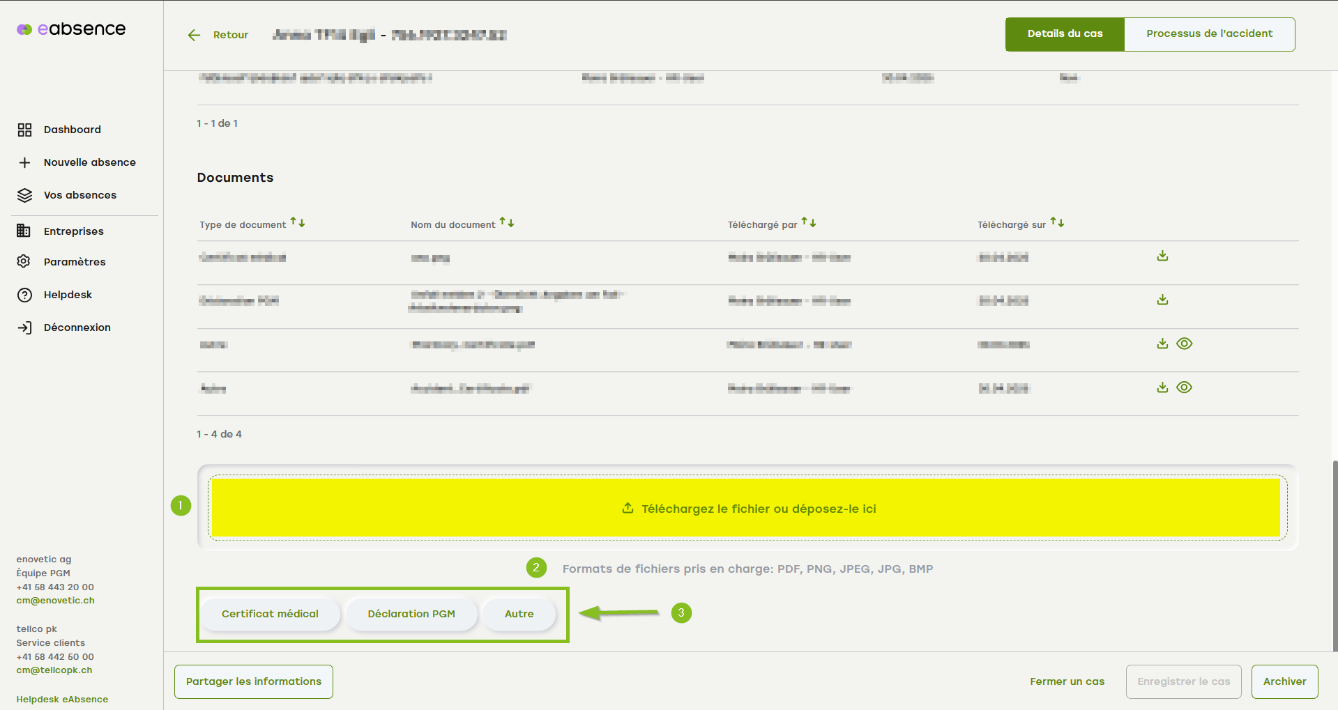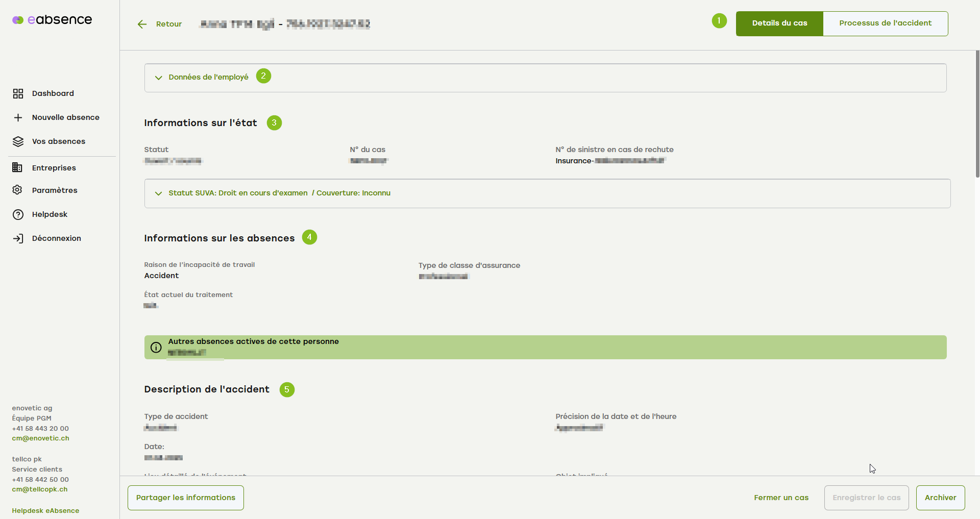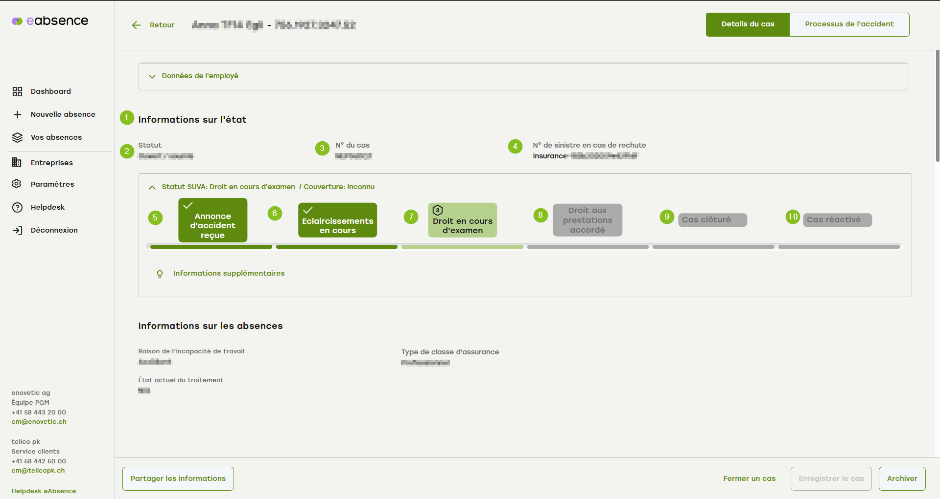 2. le statut est à nouveau visible ici, avec l'indication de l'annonce de cas à la SUVA.