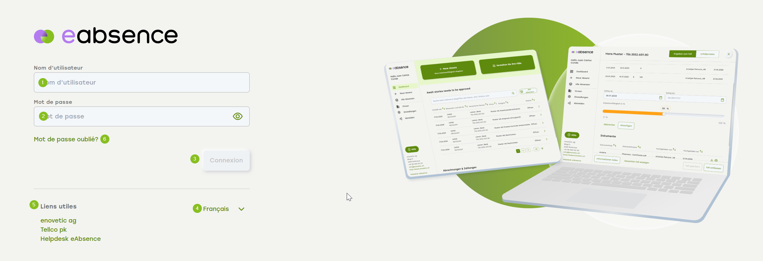 5. vous trouverez ici des liens vers enovetic ag, Tellco pk (caisse de pension) et vers la zone d'aide pour eAbsence « Helpdesk eAbsence ».