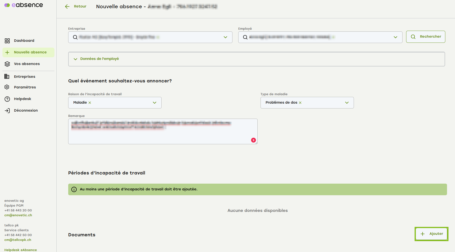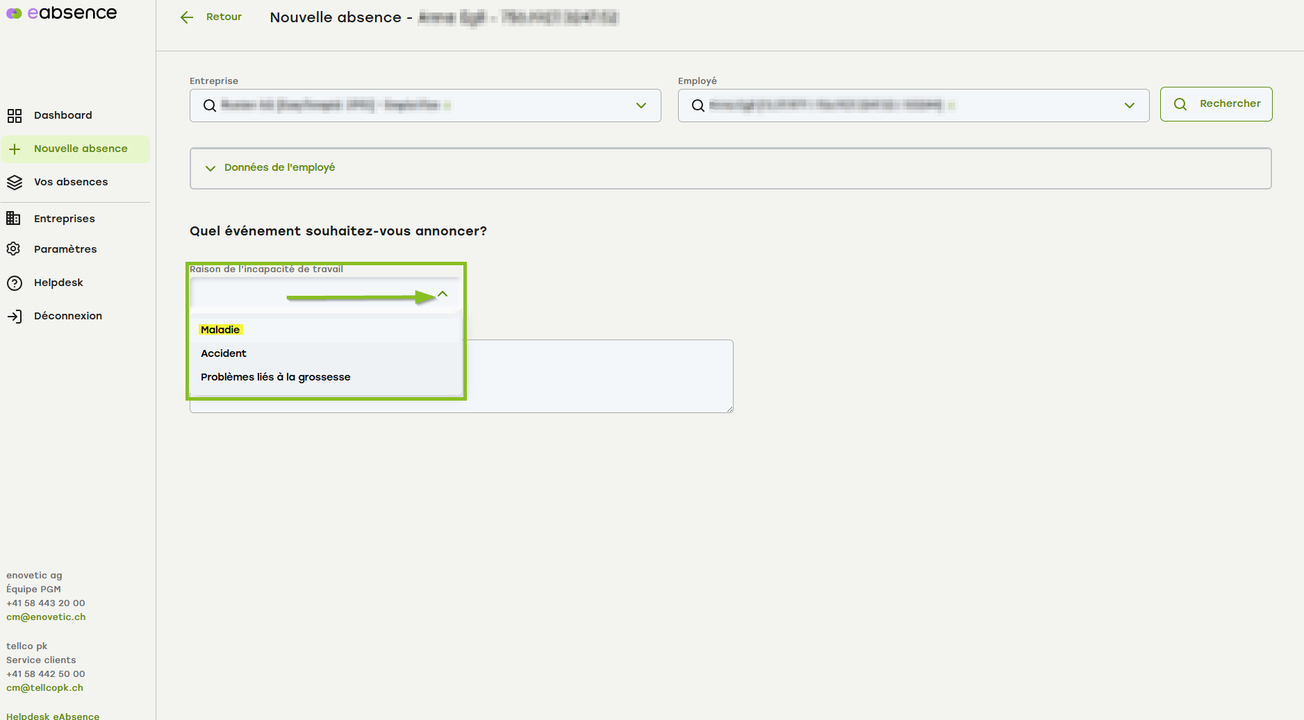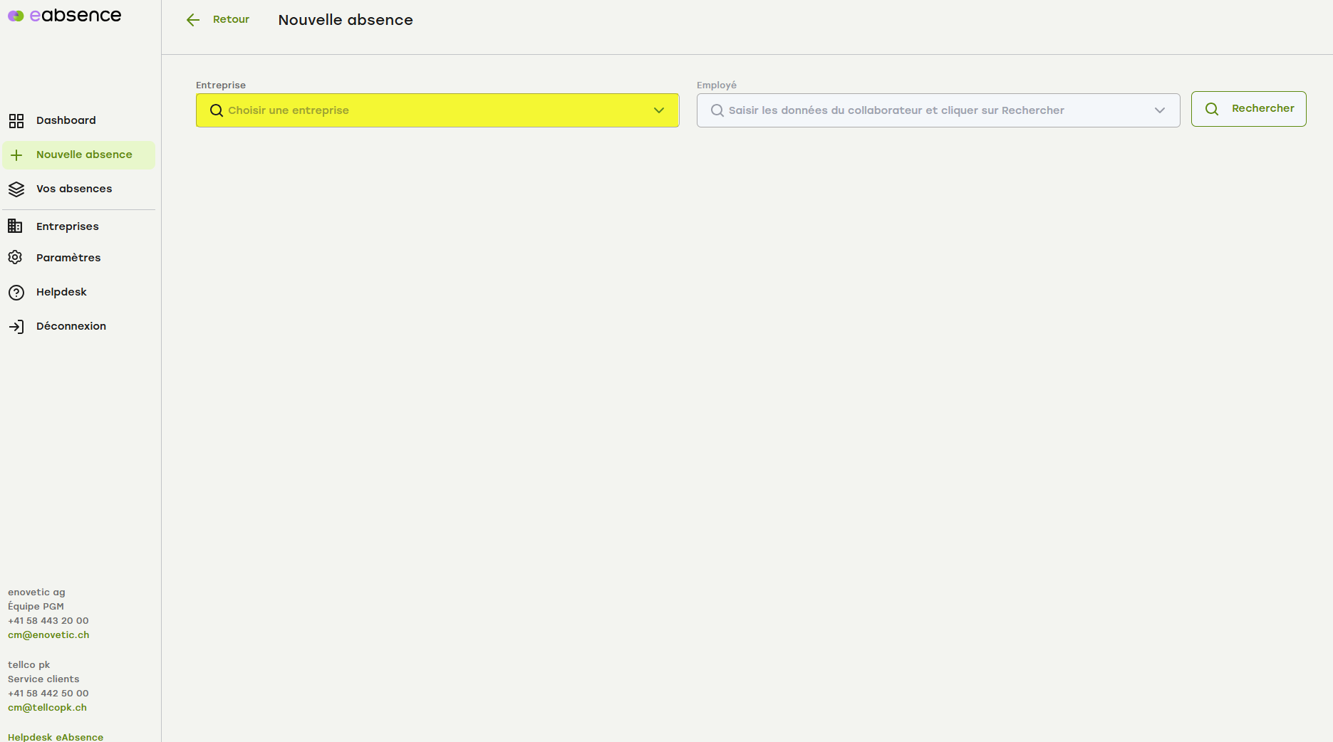Cliquez en haut au milieu sur "+ Nouvelle absence" ou dans le menu de gauche "+ Nouvelle absence" .