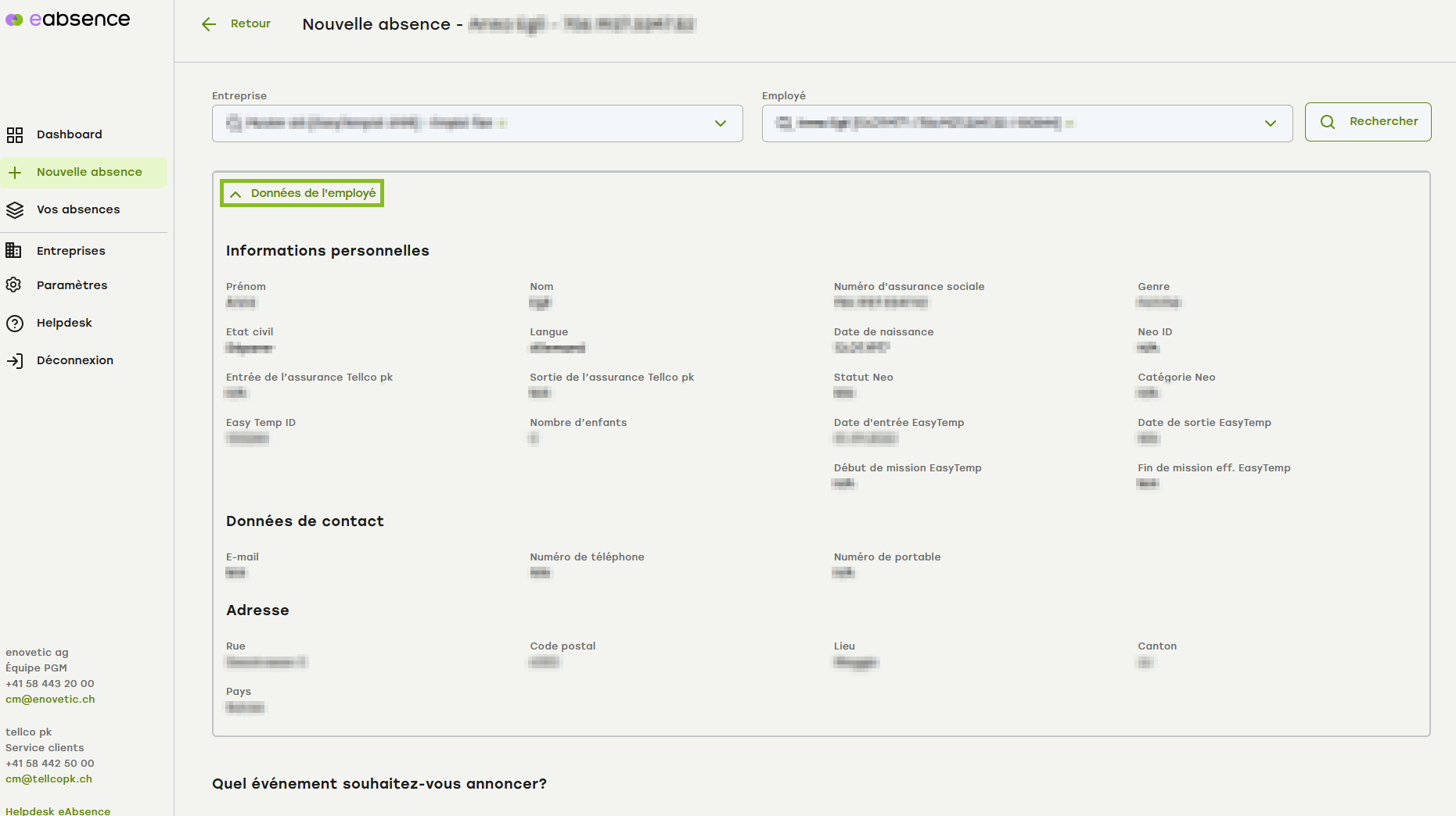 Si vous avez accès à plusieurs contrats, sélectionnez d'abord l'entreprise ou le contrat dans lequel se trouve l'employé(e)/l'assuré(e). Vous pouvez effectuer une recherche par nom ou numéro de contrat.