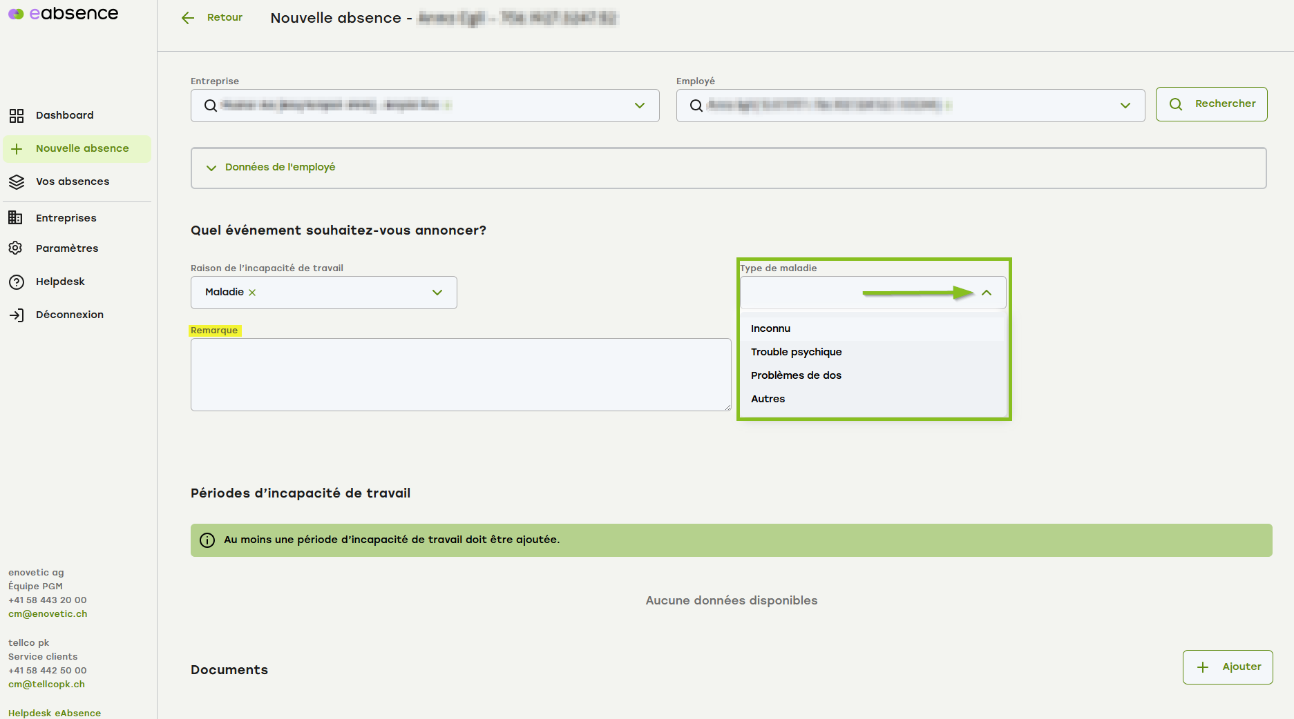 Choisissez le type/la catégorie de maladie et saisissez les éventuelles remarques et précisions dans le champ de commentaire.