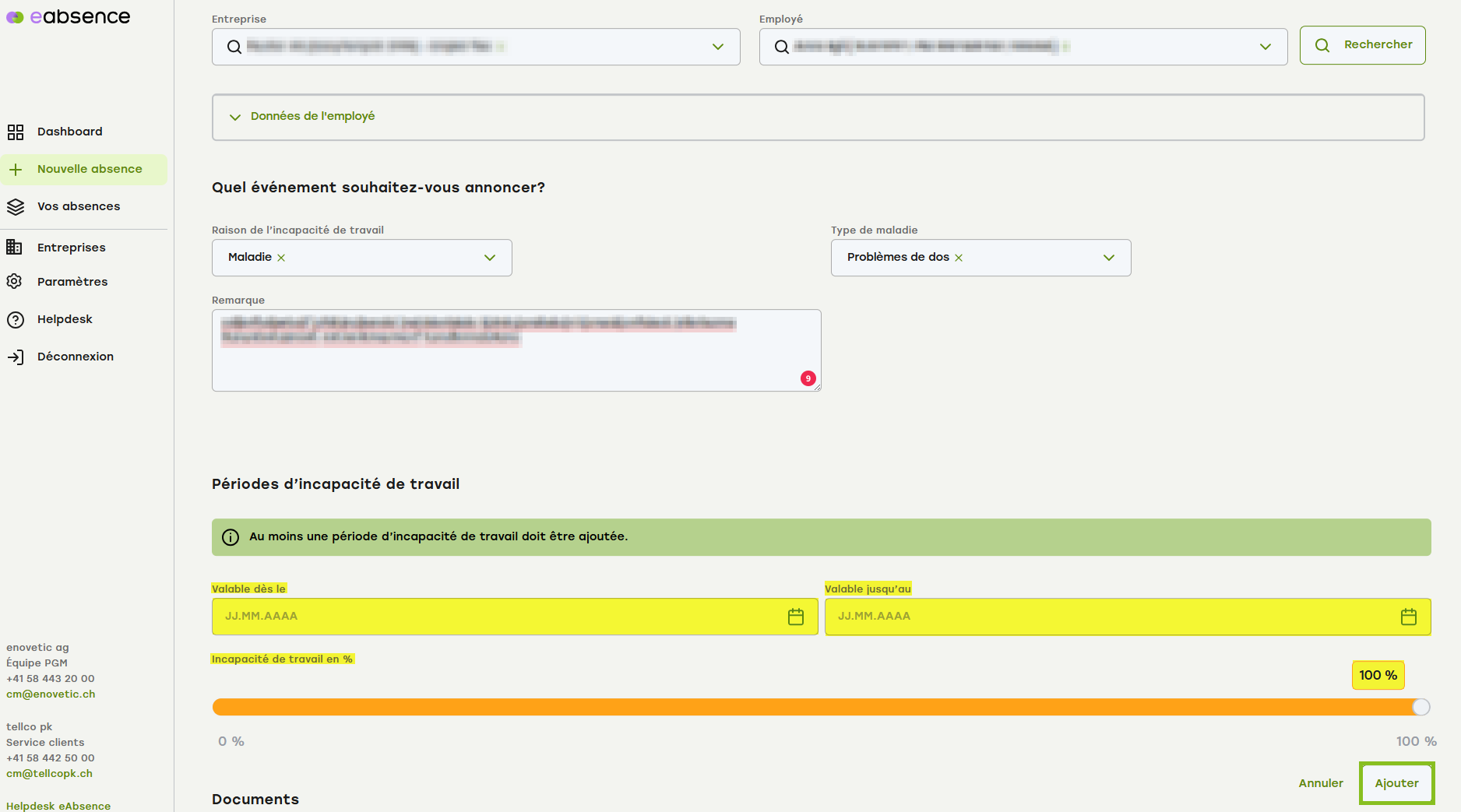 Pour saisir une période, cliquez sur le bouton "Ajouter", comme indiqué sur l'image ci-dessus. Vous obtenez alors le masque suivant. Vous pouvez saisir la date manuellement au format JJ.MM.AAAA ou cliquer sur l'icône du calendrier et la sélectionner. Vous sélectionnez les pourcentages à l'aide du curseur ou cliquez sur le chiffre et saisissez directement les pourcentages. 100 % signifie ⇒ 100 % d'incapacité de travail ; 0 % signifie capacité de travail totale. Pour reprendre la période, cliquez sur "Ajouter".