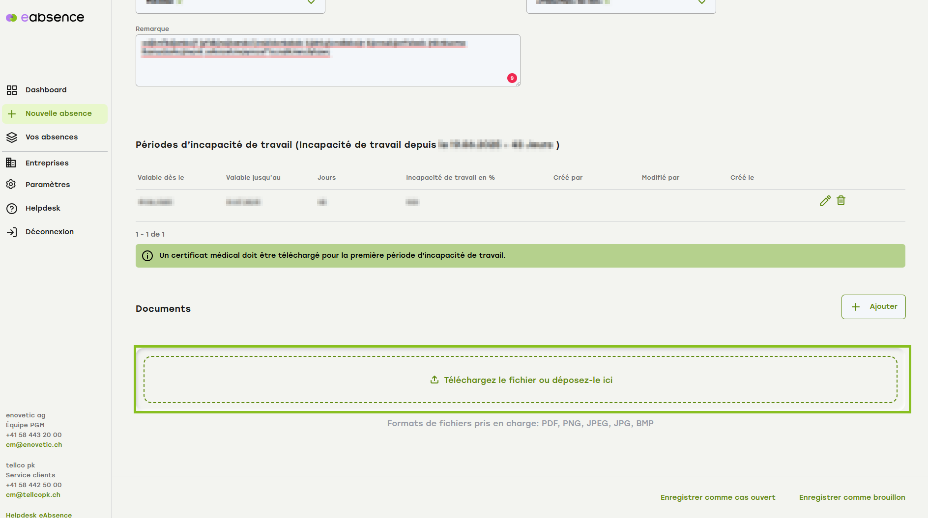 eAbsence vous signale que pour une absence, au moins une période d'incapacité de travail doit être saisie. Pour chaque certificat médical, vous saisissez une période d'incapacité de travail. S'il y a une lacune entre les certificats médicaux, mais qu'il s'agit du même type d'absence et qu'il y a un lien temporel, vous saisissez entre les deux une période avec 0 % d'incapacité de travail.