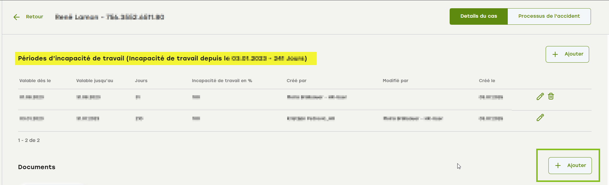 - Faites défiler jusqu'à la rubrique « Périodes d'incapacité de travail » et cliquez sur « Ajouter » à droite.