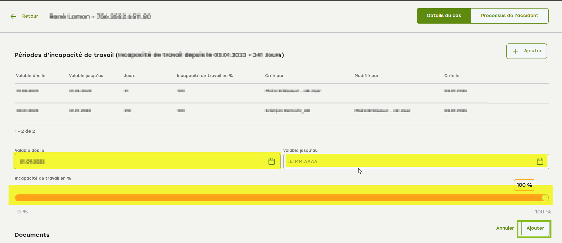 - Saisissez la nouvelle période d'absence, sélectionnez le pourcentage d'incapacité de travail et cliquez sur « Ajouter ».