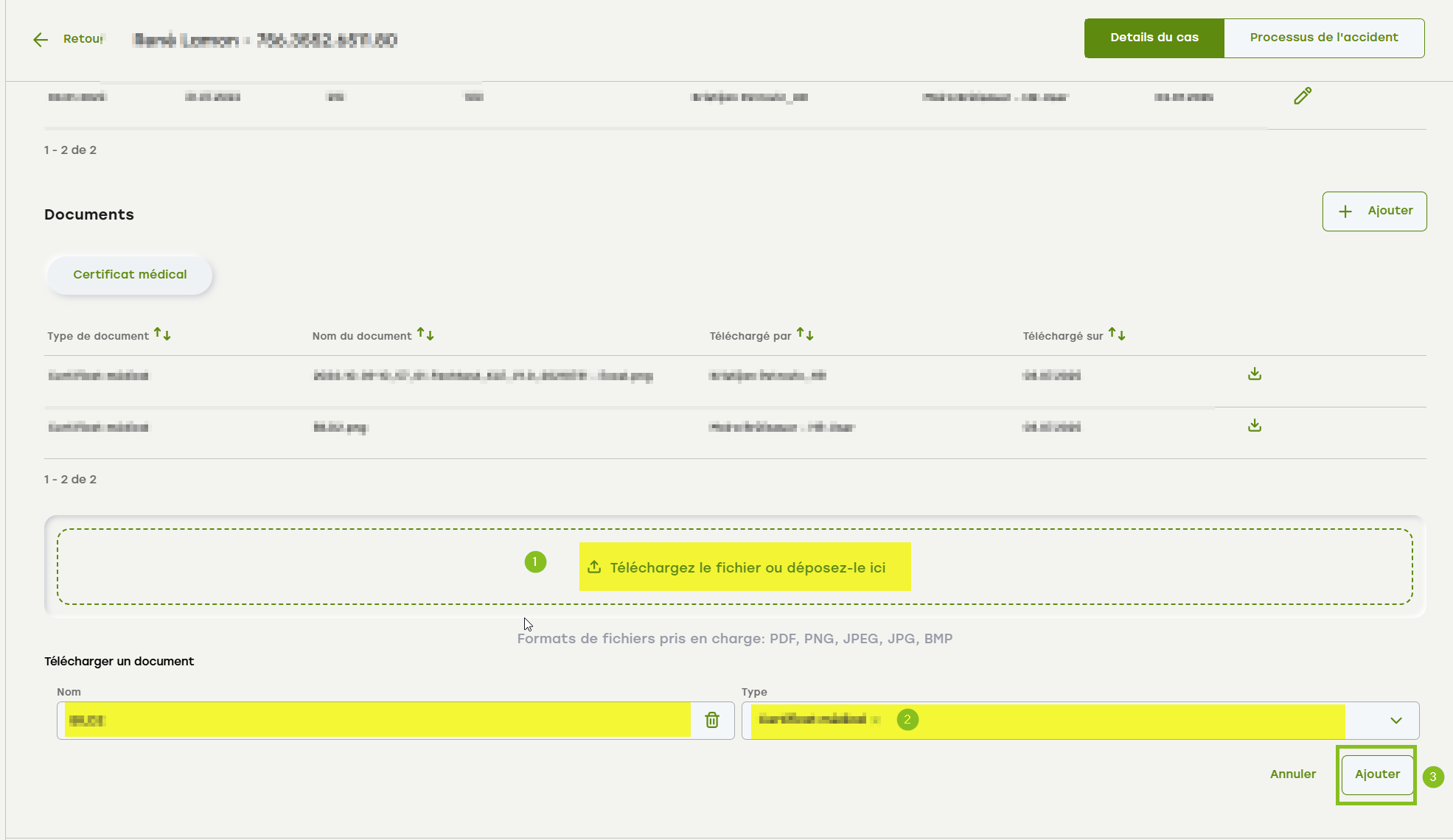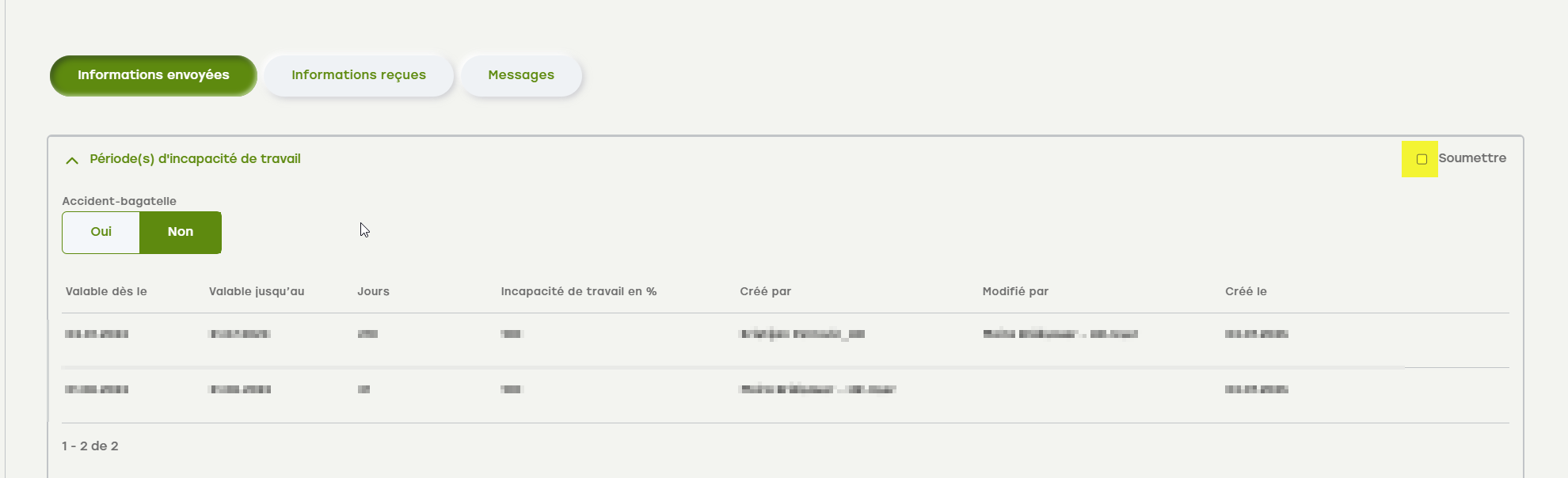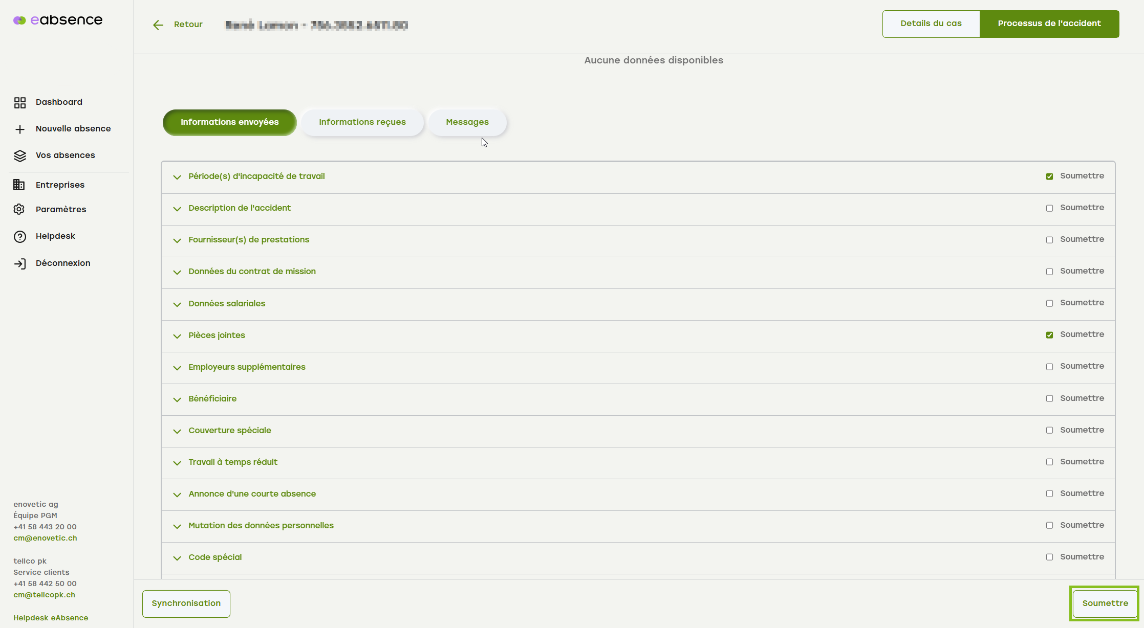 - Vous êtes redirigé par eAbsence vers la partie « Processus de l'accident » du dossier et recevez une notification vous indiquant que vous devez transmettre les modifications à l'assureur (message vert). Cliquez sur « Informations envoyées ».