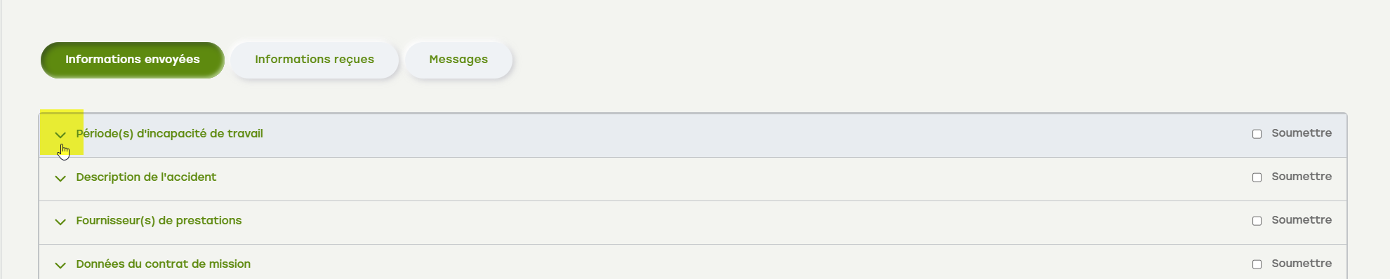 - Ouvrez le menu accordéon « Période(s) Incapacité de travail » en cliquant sur la flèche.