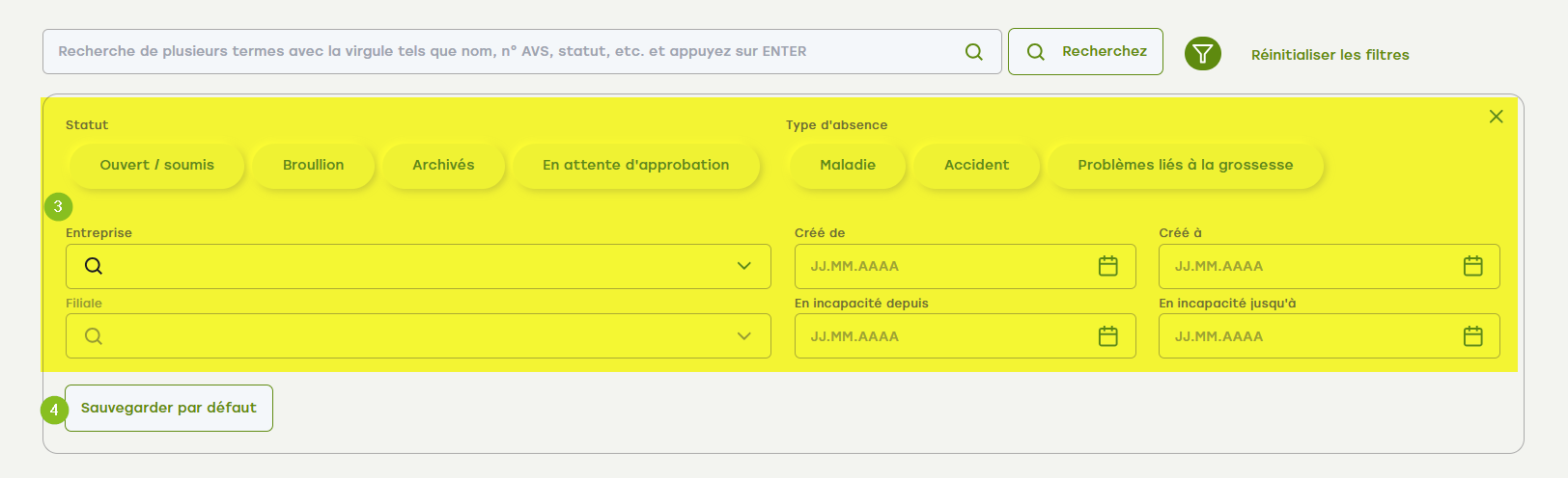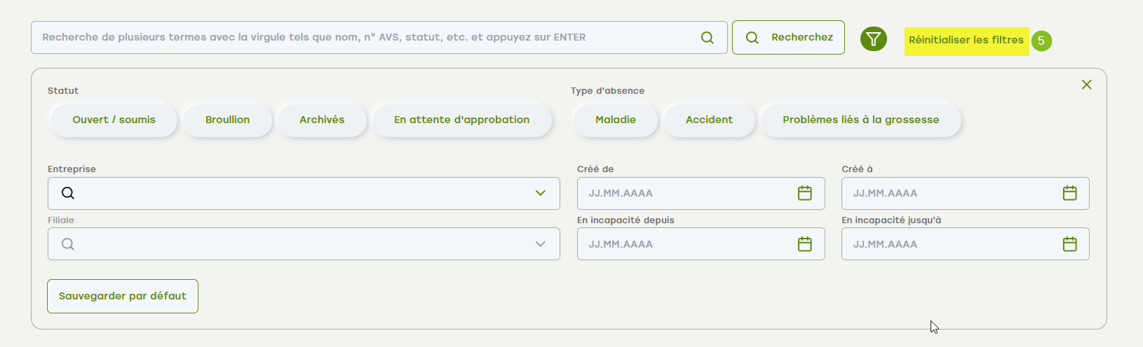- Si vous souhaitez utiliser un filtre comme paramètre par défaut pour la recherche dans « Toutes les absences », cliquez sur le bouton « Enregistrer comme standard ».