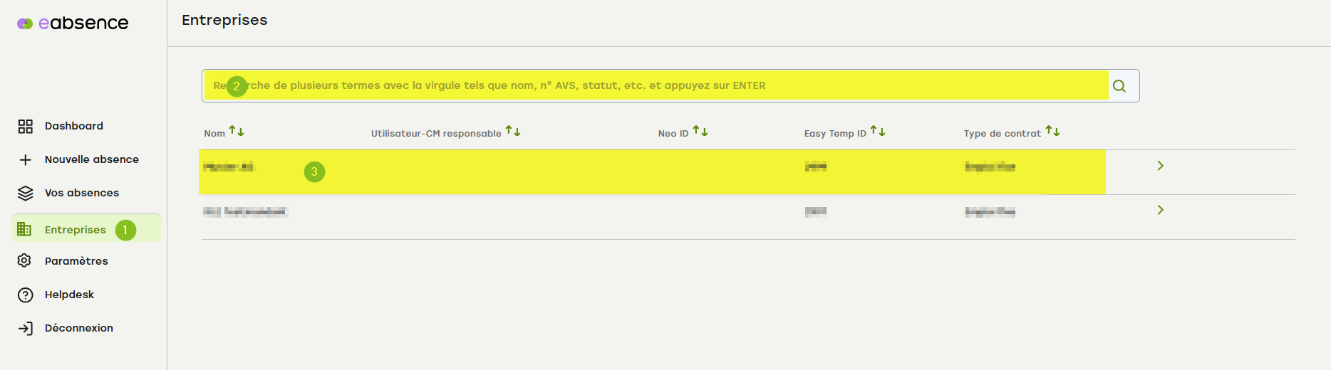 Recherche d'entreprises dans le menu « Entreprises » (accès à plusieurs contrats/entreprises)